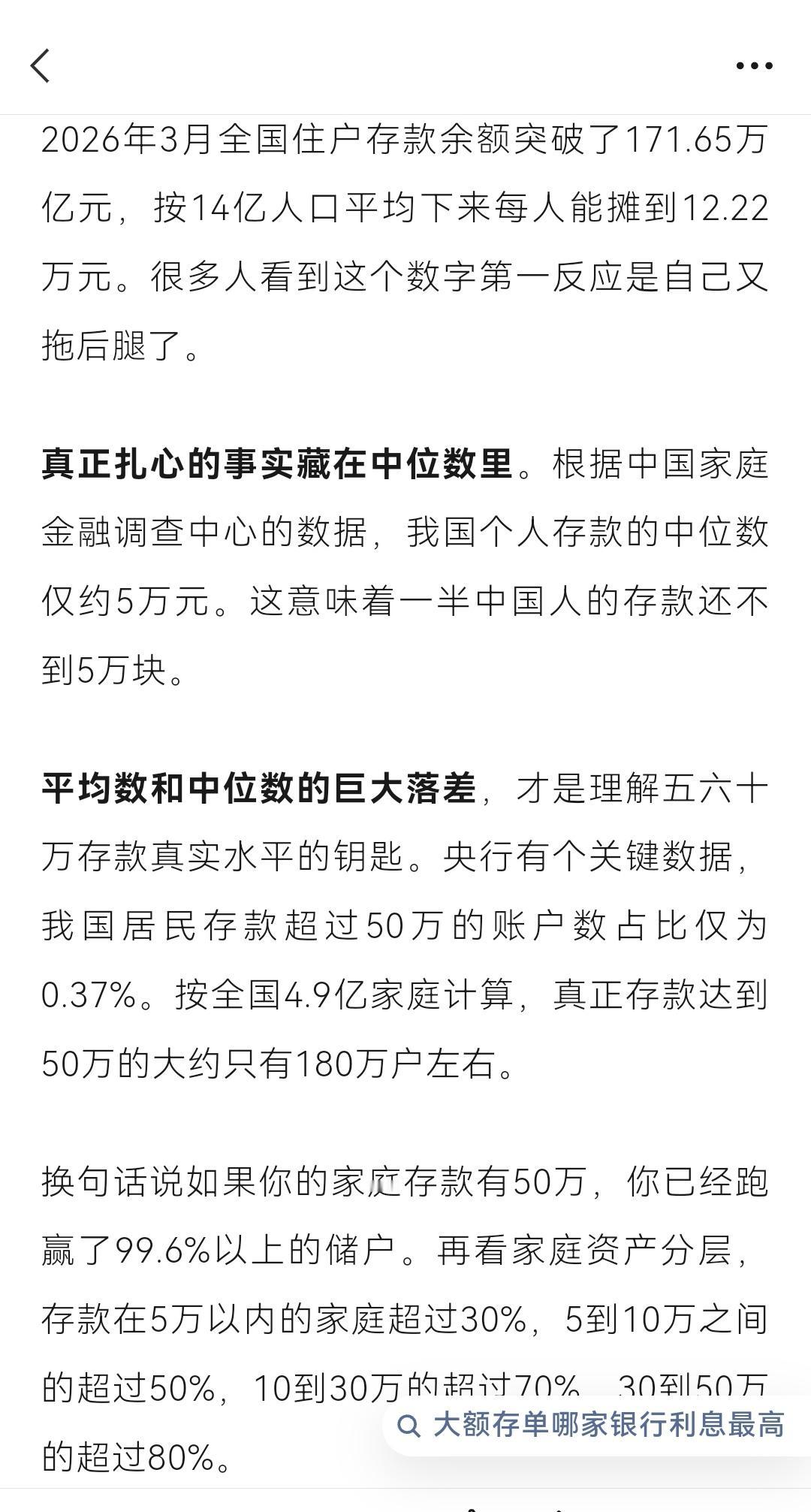 央行有一组数据,我国大约有4.9亿家庭储户。存款超过50万的,大约180万户。占总家庭户数的0.37%。也就是说我国极少部分家庭存款超过50万元。