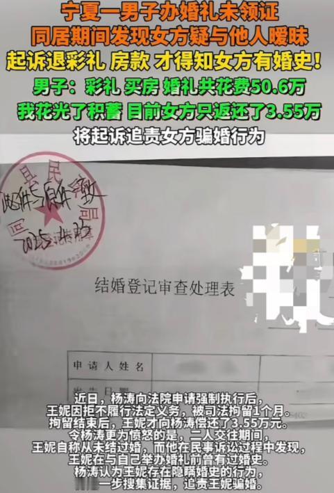 宁夏,一37岁男子花彩礼50万,与相亲女子订婚,岂料同居期间,男子发现未婚妻与他人发生不正当关系,女子竟辩称这只是角色扮演,男子取消婚约要求女子退钱,女子却只退3.55万,宁可被拘留也不退剩下的钱!