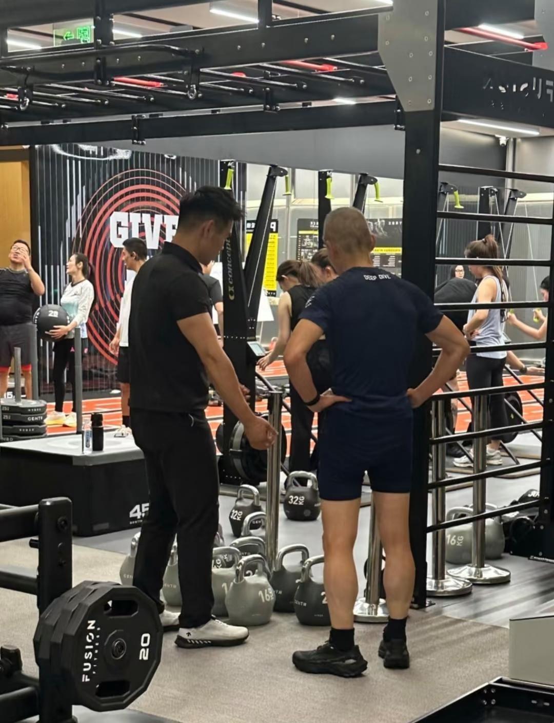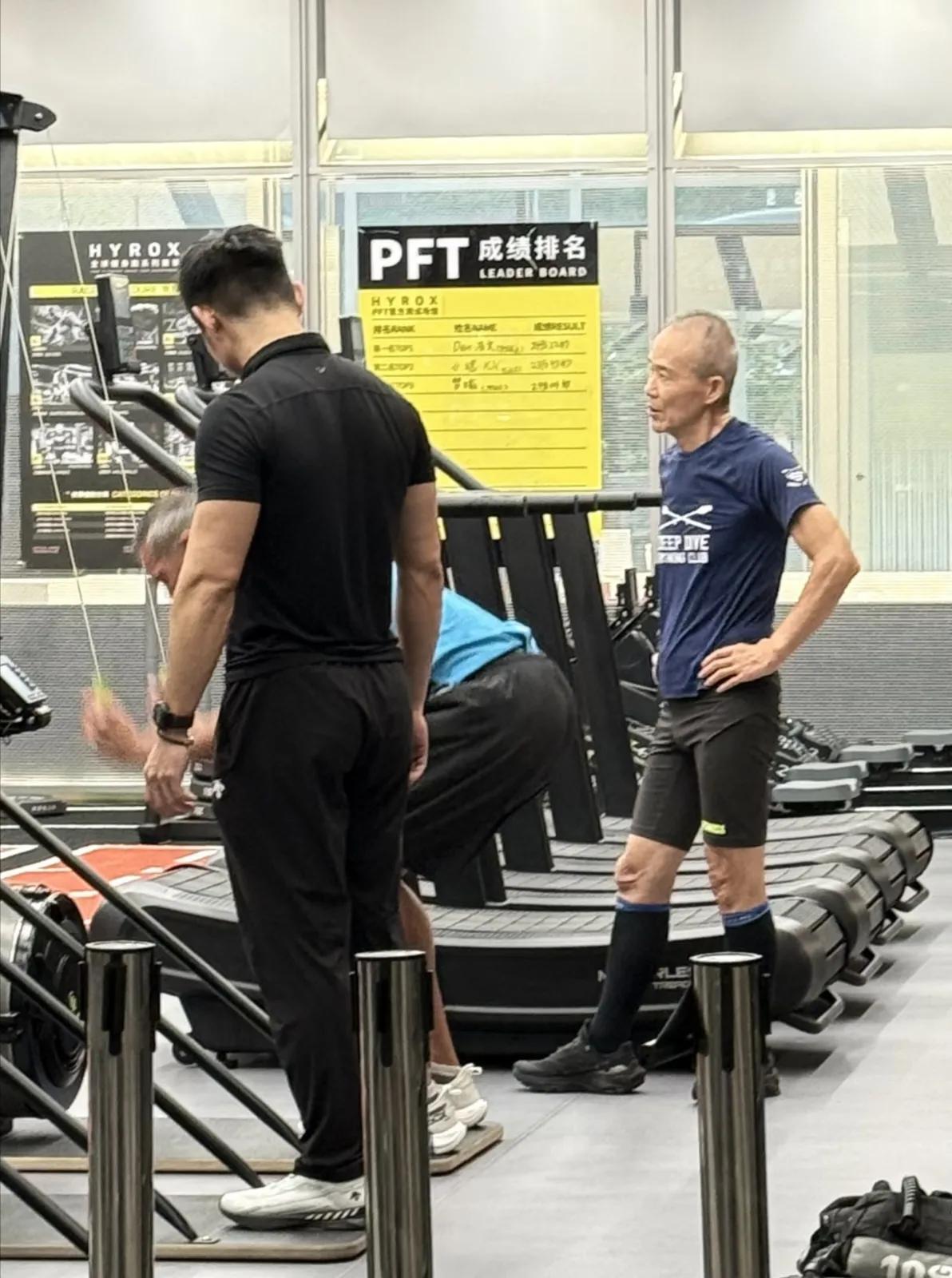 王石现身健身房锻练肌肉,他一会练举重,一会练拉伸,还认真听取教练安排,每个动作做得很标准,丝毫没有因为年龄而做不动。
