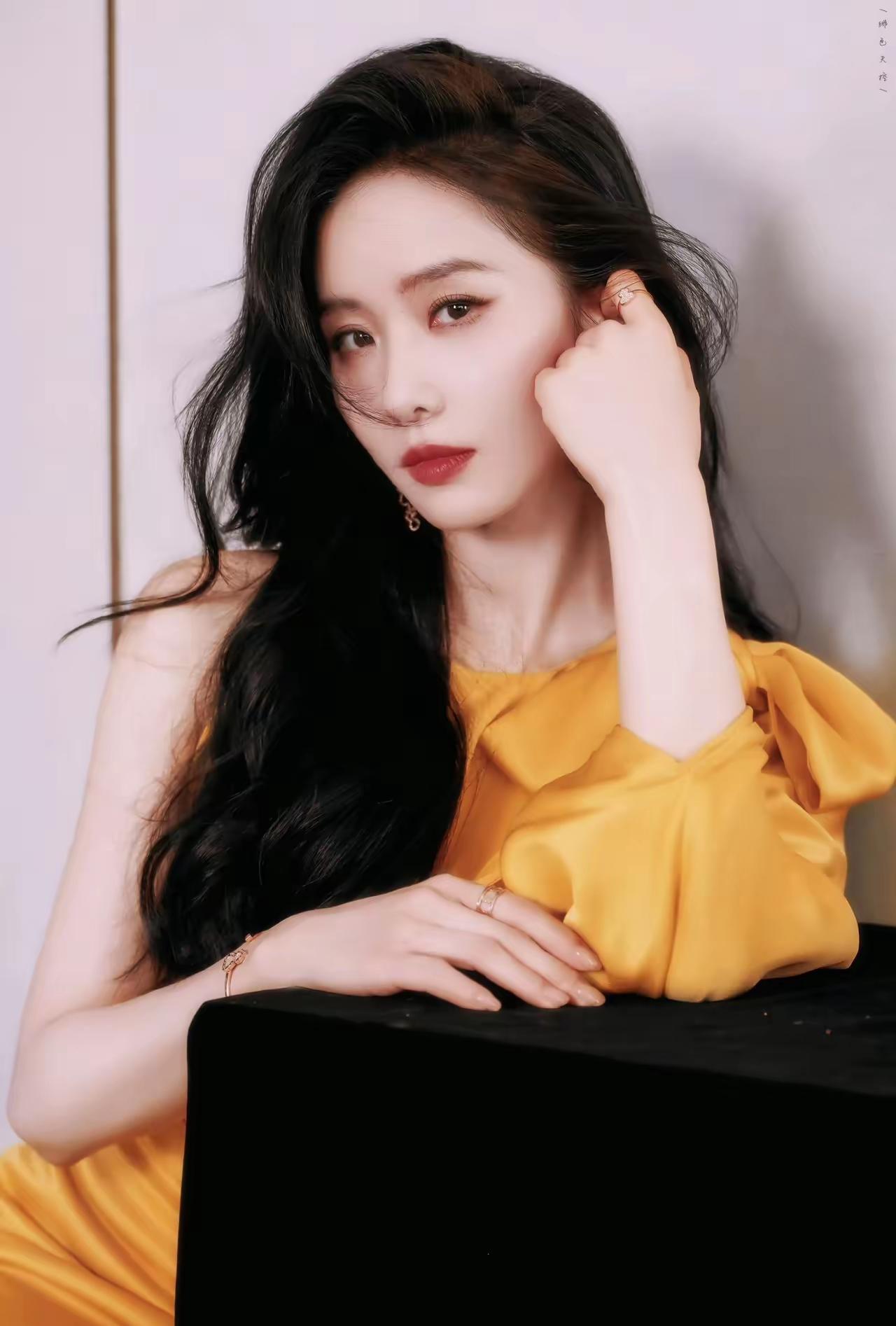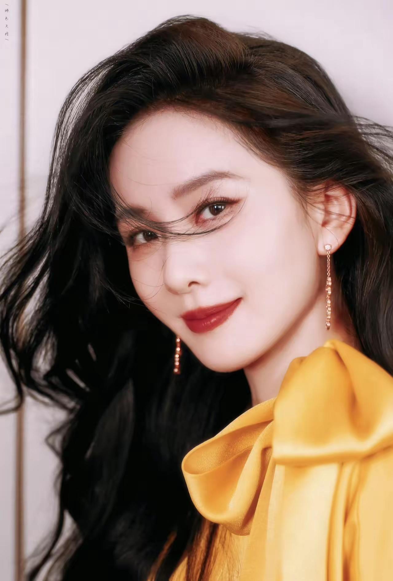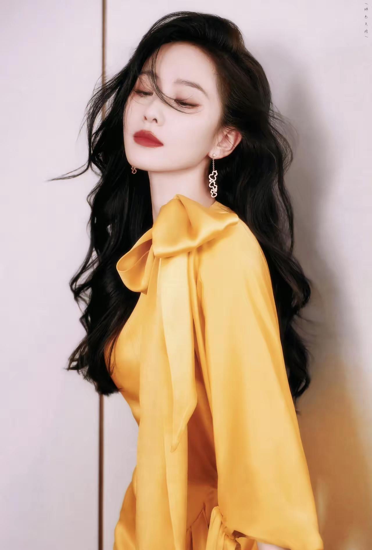 美女壁纸~刘诗诗身着暖黄色缎面礼服,肩颈处的蝴蝶结柔化了线条,自带柔光质感的面料衬得她温柔又贵气