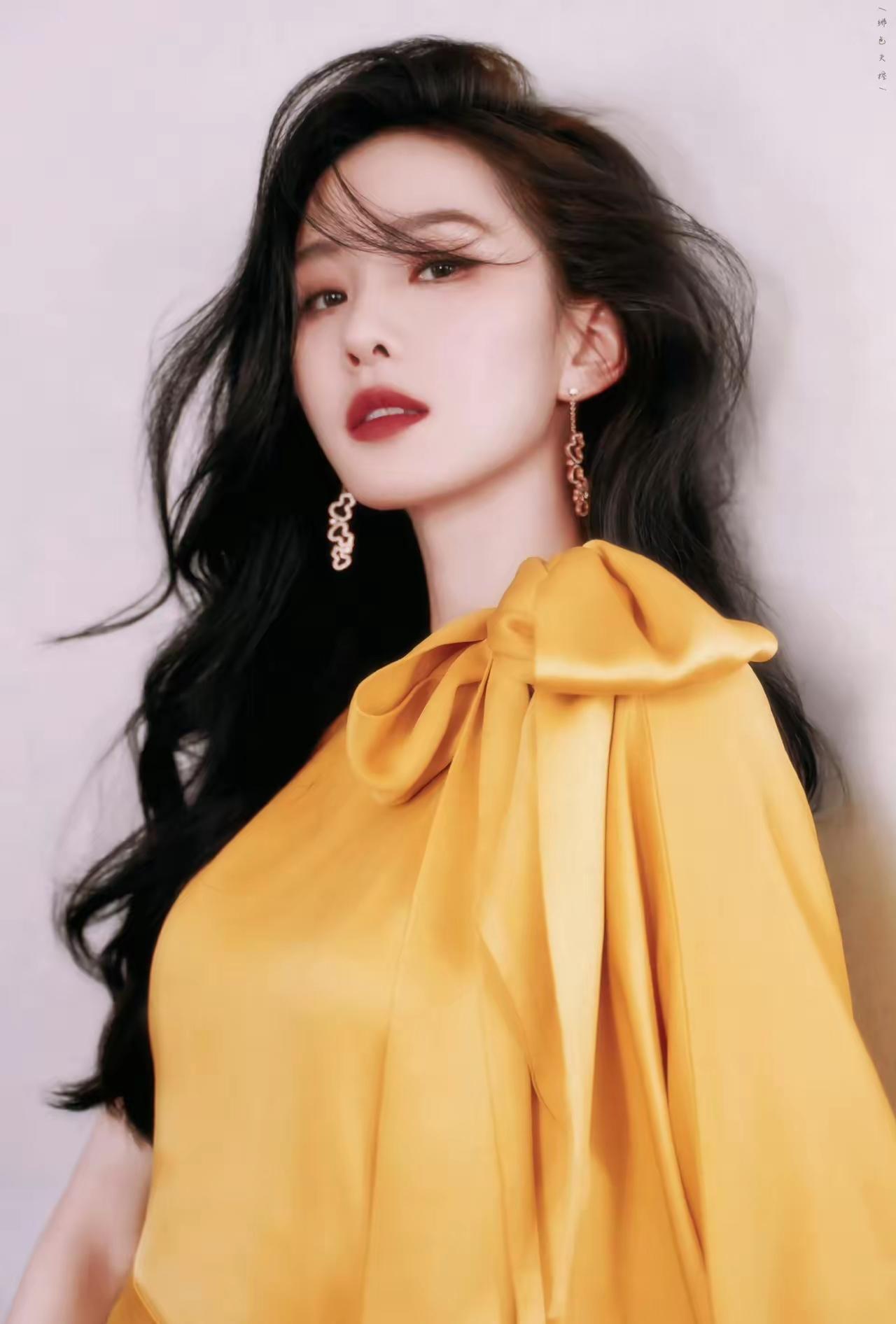 美女壁纸~刘诗诗身着暖黄色缎面礼服,肩颈处的蝴蝶结柔化了线条,自带柔光质感的面料