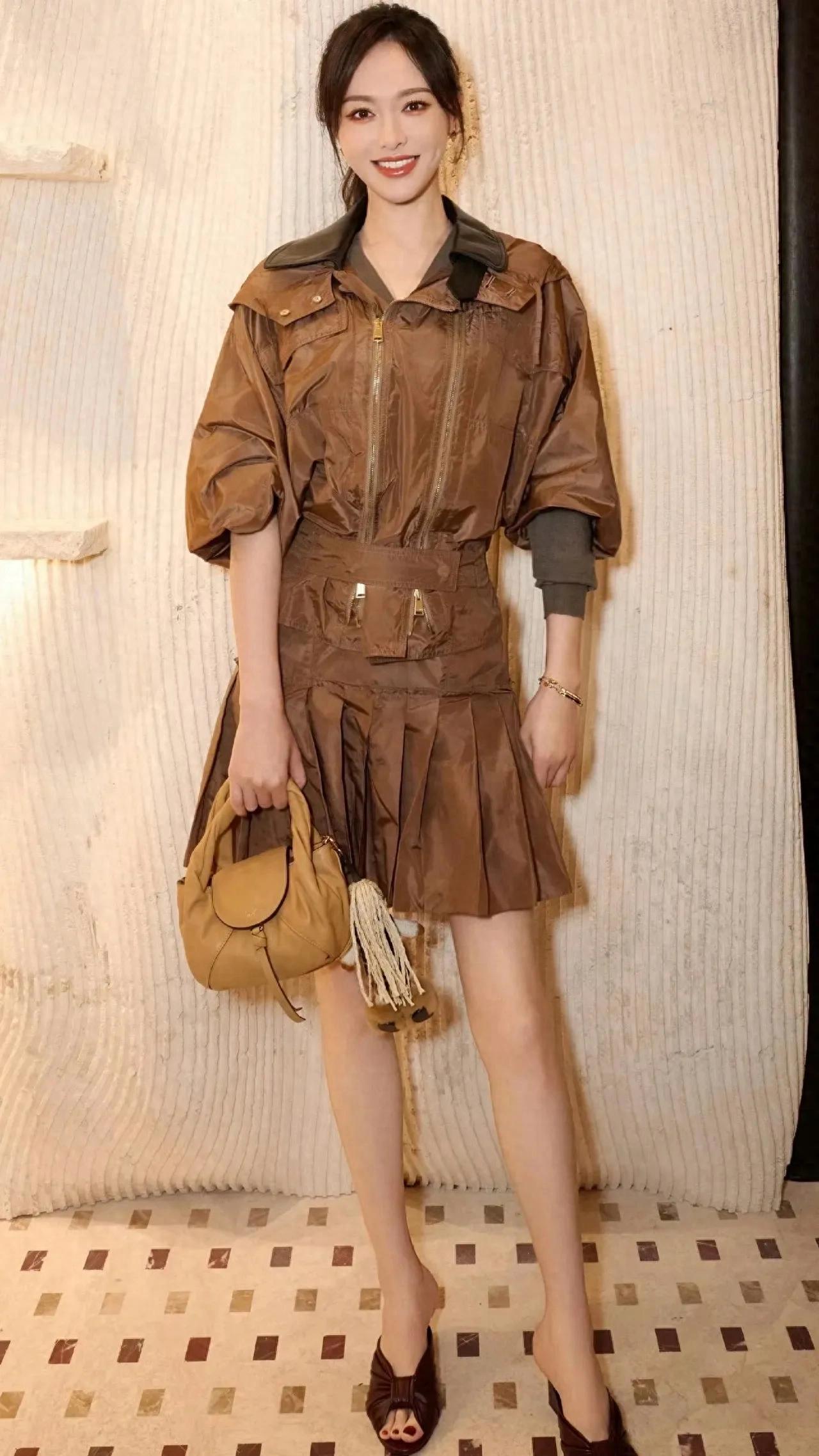 唐嫣身穿一身咖色套装裙搭配高跟鞋