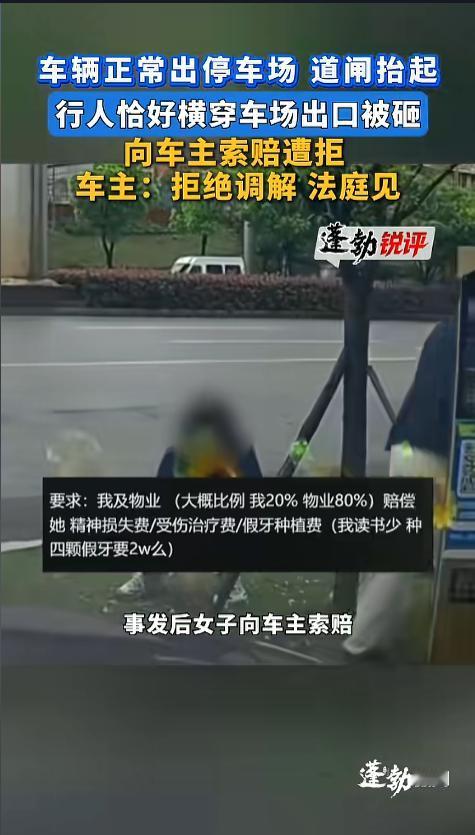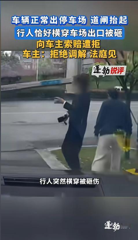 信息来源:《车辆正常出停车场,道闸抬起时,行人恰好横穿车场出口被砸!行人向车主索赔遭拒 ,车主:拒绝调解 法庭见!》蓬勃新闻