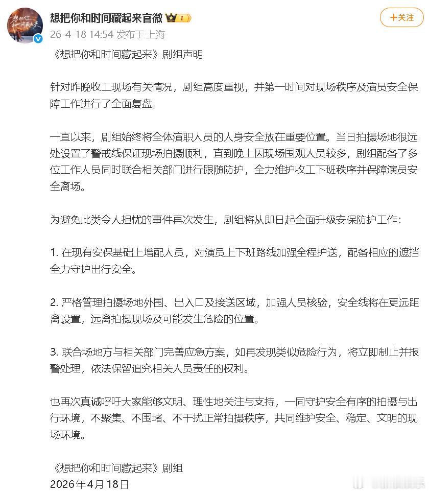 剧组回应王安宇疑似被激光笔照射 近日,有网友发现下班路上疑似被激光笔照射,王安宇后援会就此喊话《想把你和时间藏起来》剧方,引发热议。刚刚,剧集官微发布声明回应,称当日剧组配备了多位工作人员联合相关部门进行跟随防护,保障演员安全离场。剧方称将全面升级安保防护工作,“如再发现类似危险行为,将立即制止并报警处理,依法保留追究相关人员责任的权利。”