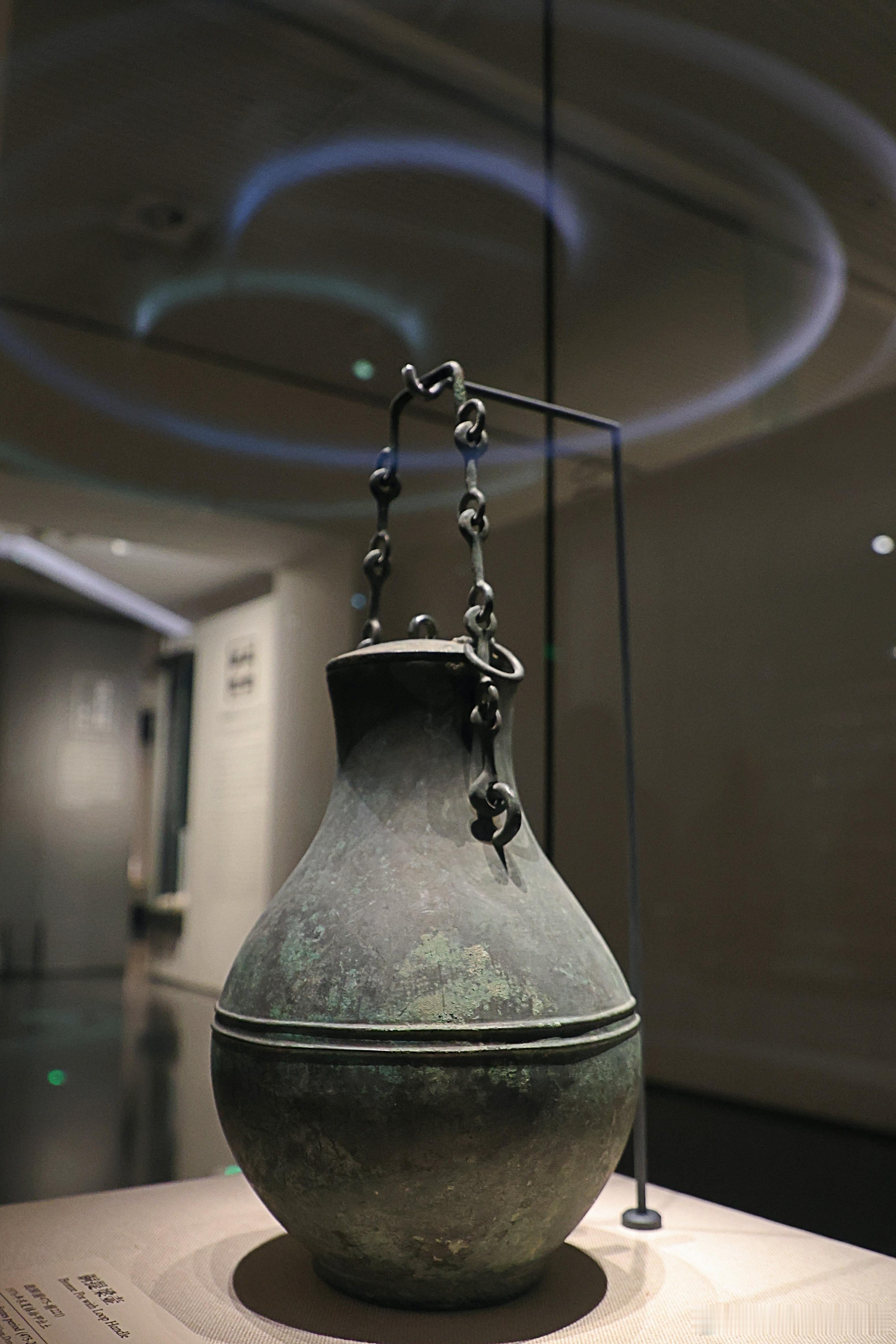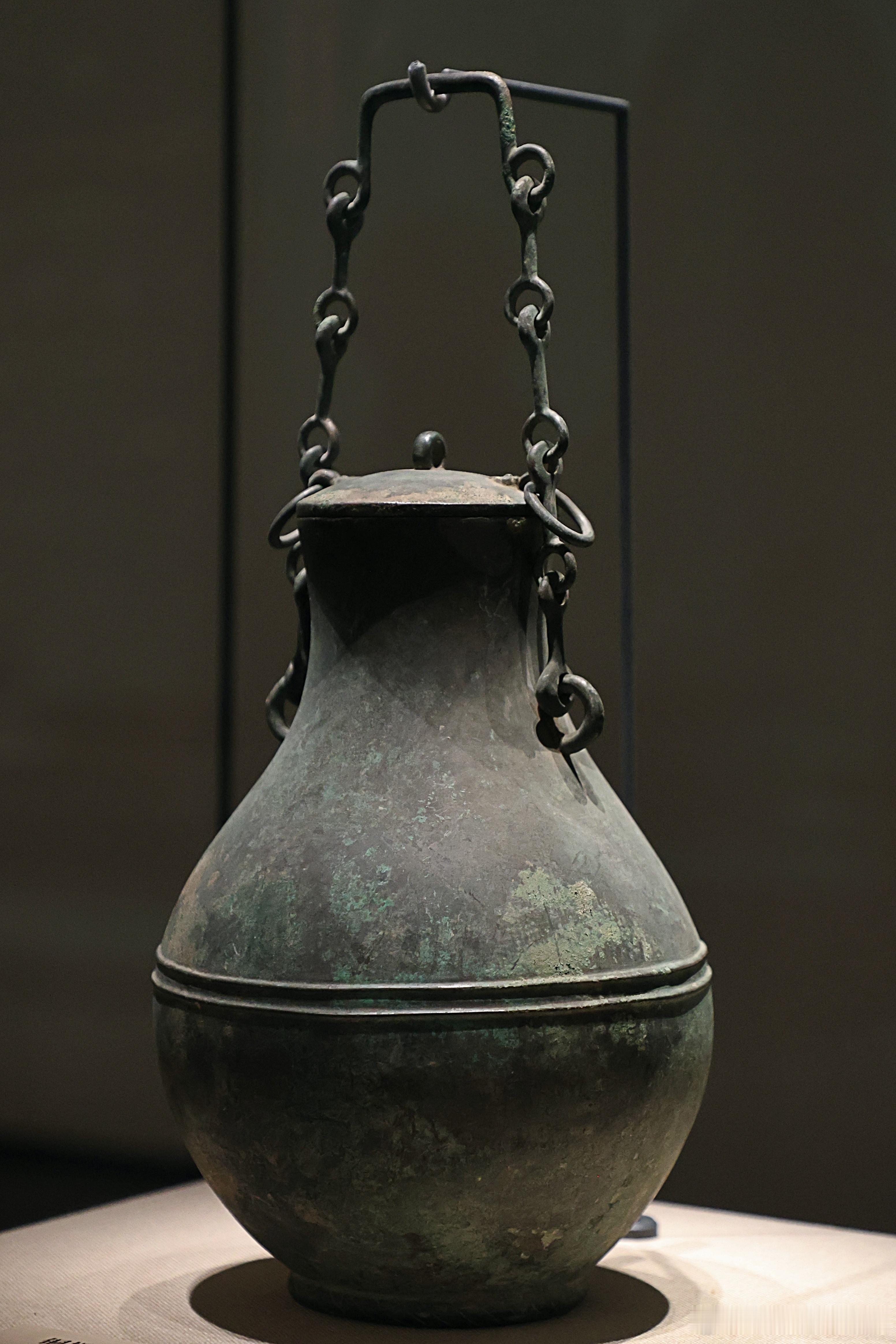 我的2026 铜提梁壶战国 (公元前475-前221年)青州博物馆藏1976年青州市东夏镇拾甲村战国墓出土。口径18厘米,高35厘米。这件提梁壶看上去平淡无奇,实则毫不简单。壶盖两侧各有一只环形耳,并各套一只活动的大圆环,颈部下方也各有一竖状环形耳。链条式的提梁穿过两侧的两侧大环,两端与颈部的小环相连。提梁与环形耳环环相套,却永远不能单独取下。约会博物馆 文物