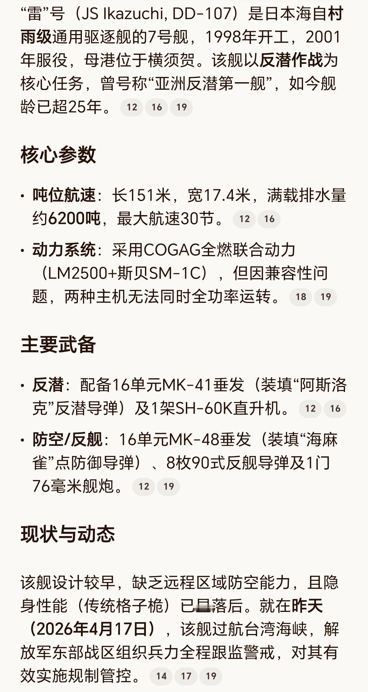 东部战区披露:日舰过航台海近14小时这14个小时,日舰可谓是提心吊胆战战兢兢!早苗,你好歹也派个先进一点的舰船,派个服役已二十五年的老古董过航台海,有点恶心人的意思!不夸张的说,解放军一艘054A型护卫舰,就能吊打一艘小本子“雷”号村雨级驱逐舰,因为054A型护卫舰的雷达系统区域防空能力、火力系统、动力系统、隐身设计等方面都比小本子“雷”号村雨级驱逐舰强好多!其实别说小本子基本上没有与时俱进的先进舰船,就是小本子的丑国大哥,除了福特号航母除了伯克利级驱逐舰稍微与时俱进外,其它舰船基本上都算是老旧老古董了。