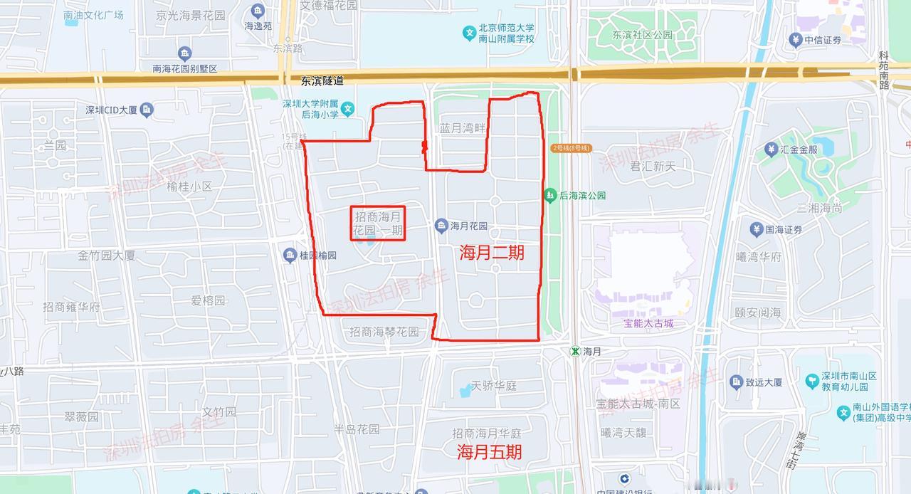 招商海月花园是深圳市南山区后海片区的综合性住宅社区,由深圳招商房地产有限公司开发,分三期建设(1999-2005年)。项目总占地面积23万平方米,建筑面积53万平方米,合计3400户住宅,物业由招商局物业管理有限公司统一管理。