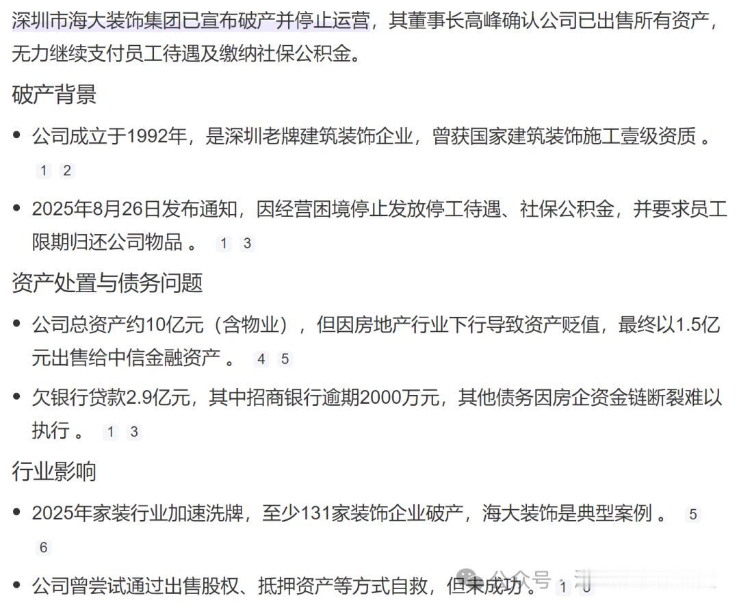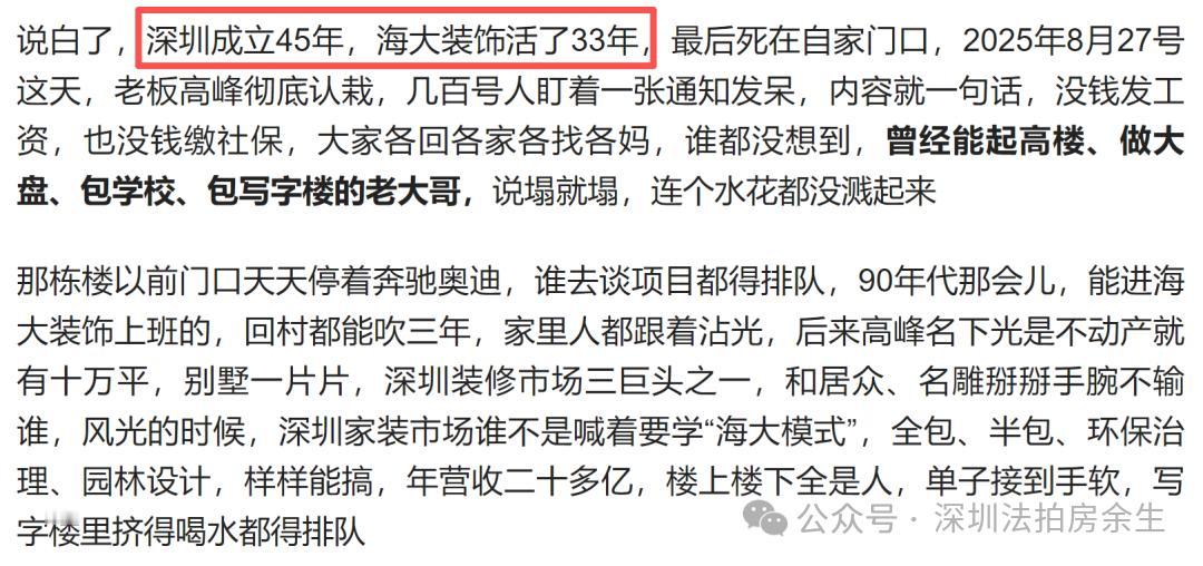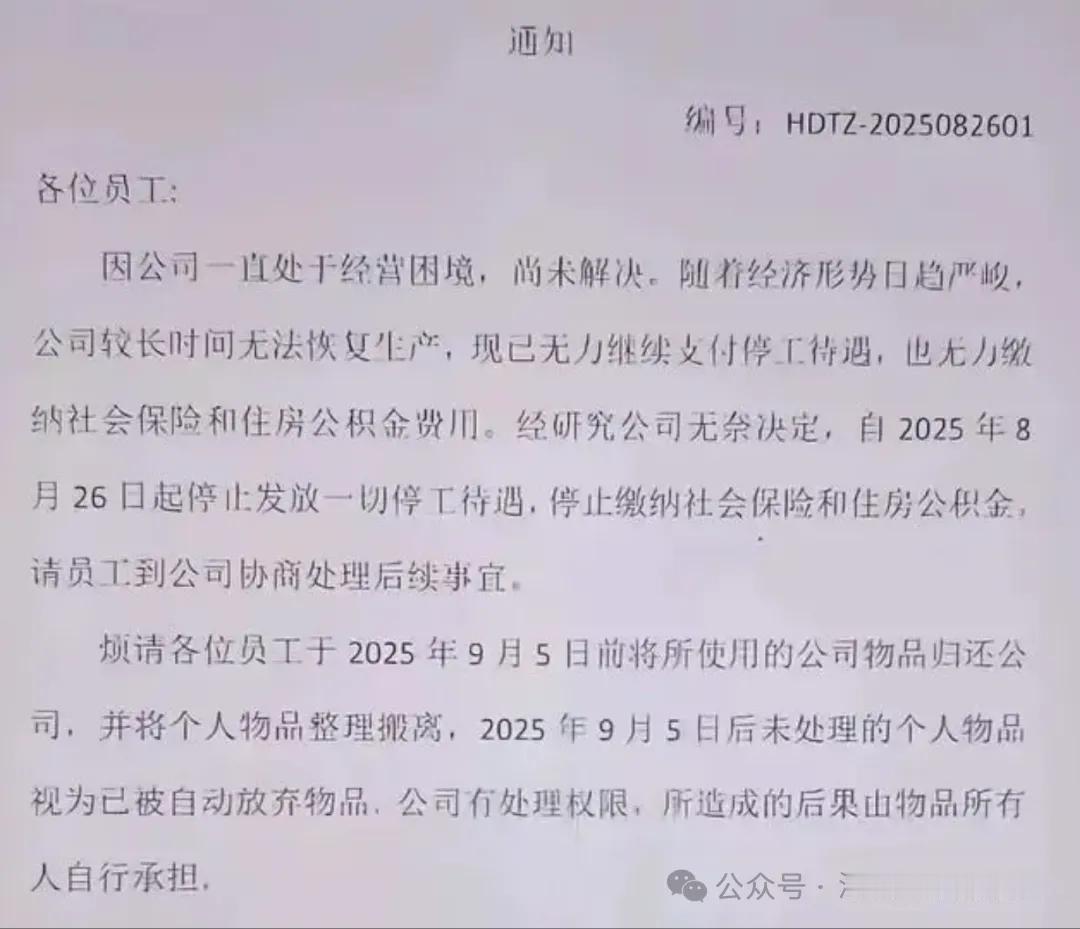 2025年8月26日,深圳海大装饰集团向员工发出一纸通知:“停止发放一切停工待遇,无力缴纳社保和公积金”。