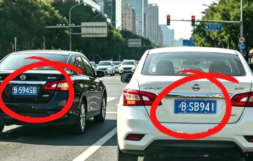 画面中,黑色轿车车牌为“辽B·594SB”,白色轿车车牌则是“辽B·SB941”,两个自带“梗”的车牌并排停在路口,尴尬效果直接拉满。