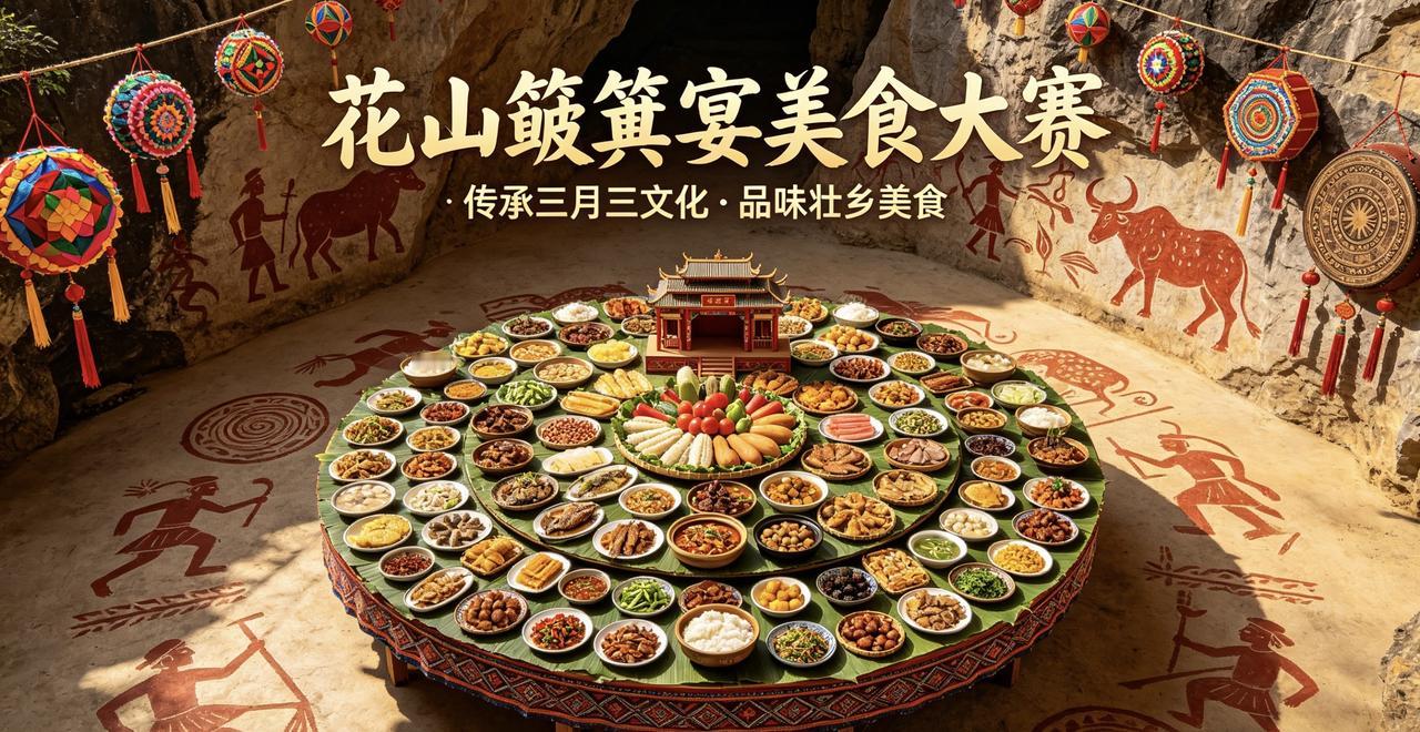 最绝的是花山簸箕宴美食大赛,所有作品统一展示在直径10米的圆形长桌上,融入了花山岩画、三月三等主题元素,现场观众投票选美味,场面相当壮观。