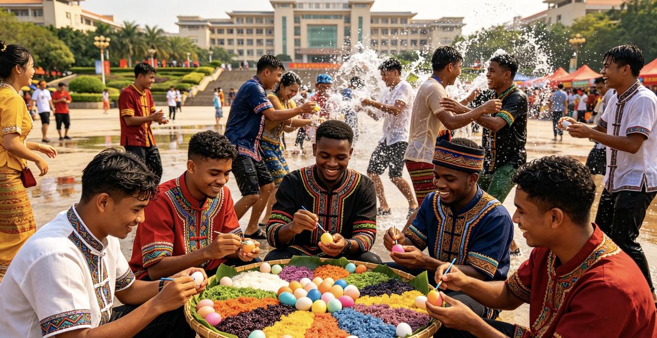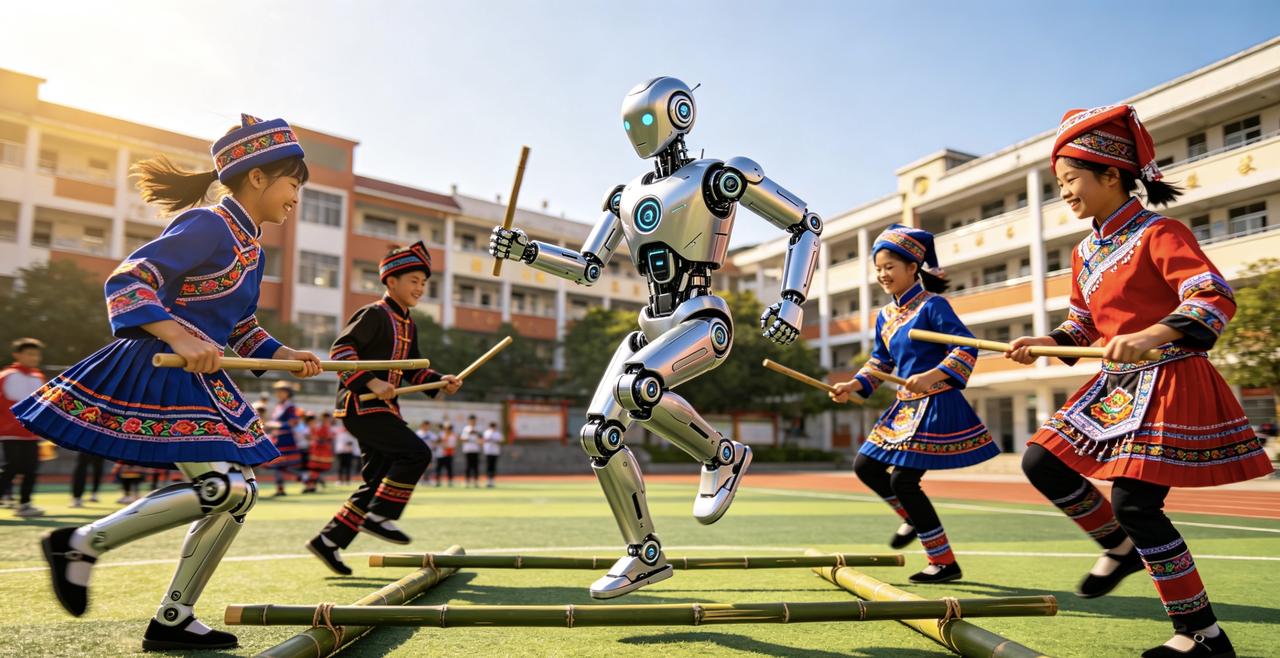广西民族大学的泼水广场上,来自东盟各国的留学生和各族学生一起制作五色糯米饭、绘制彩蛋、泼水狂欢,壮乡的节日氛围早已走出了国门。在河池的一所学校里,身着少数民族服饰的机器人跳起了竹竿舞,动作精准、节奏踩点,网友笑称:“怪不得没转身之前感觉舞姿不像本地的!”。