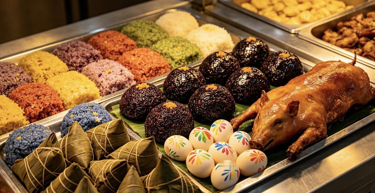 在广西能源大厦职工食堂里,五色糯米饭成了当之无愧的“C位主角”,旁边还配着黑米粽、烤猪、彩蛋,每一样都让人垂涎欲滴。五色糯米饭代表吉祥如意、五谷丰登,咬一口糯叽叽的,广西的春天就全在嘴里了。