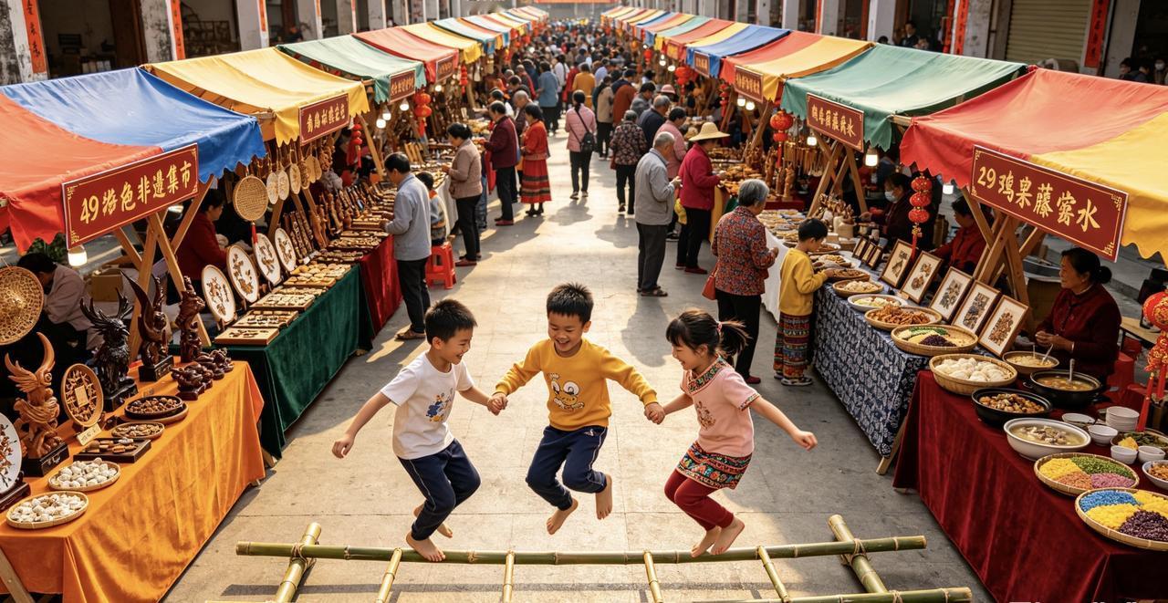 而在北海的非遗集市上,49个特色摊位一字排开,角雕、贝雕、木雕琳琅满目,五色糯米饭、鸡屎藤糖水的香气飘满整条街。竹竿分分合合之间,孩子们在开合跳跃中发出阵阵欢笑。桂平市图书馆的“文艺+非遗+美食”活动更是人气爆棚,山歌对唱、民族服装走秀、集体圈圈舞轮番上演,八桂风情拉满。