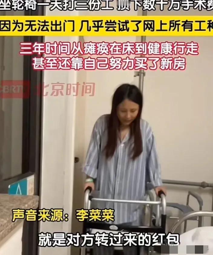 因为身体瘫痪无法外出,她就坐着轮椅,靠着一部手机同时打三份零工,做线上客服、手工代做、数据录入,每天从清晨忙到深夜,困了就趴在床边眯一会儿,伤口疼得受不了就咬紧牙关硬扛。她一分钱都舍不得乱花,把所有辛苦挣来的钱,全部攒起来当做手术费和医药费。