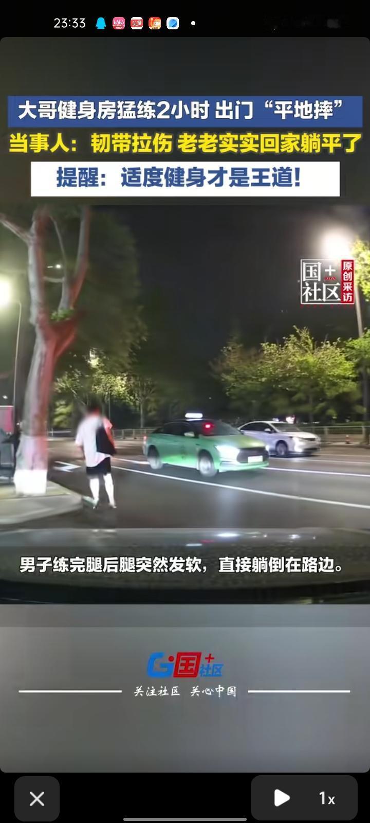 4月14日,陕西西安。男子在健身房猛练两小时,出门“平地摔”。一开始没感觉,结束后他感到不舒服,没想到走着走着就倒下了。 当事人表示,朋友赶紧把我扶起来,目前韧带已经拉伤,正在家休养。提醒大家健身一定不要盲目上强度,一定要适度。