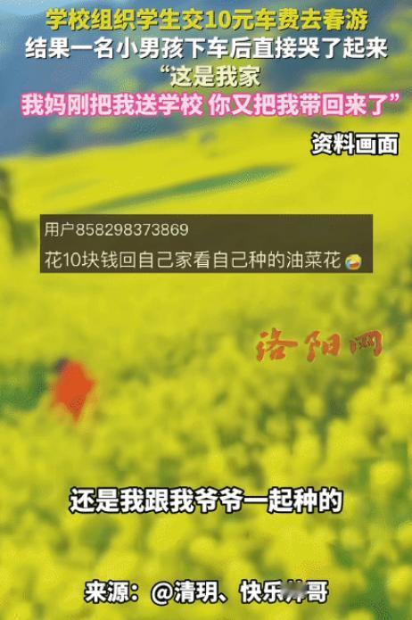 带队老师发现了他的异常,赶紧走过去,轻轻拍了拍他的肩膀,询问他怎么了。小男孩一边抹眼泪,一边哽咽着说明缘由,原来,学校选定的春游花海,就在他家门口,他刚被妈妈送到学校,跟着大巴车绕了一圈,又被送回了家,相当于花10元钱坐了一趟往返家校的专车。