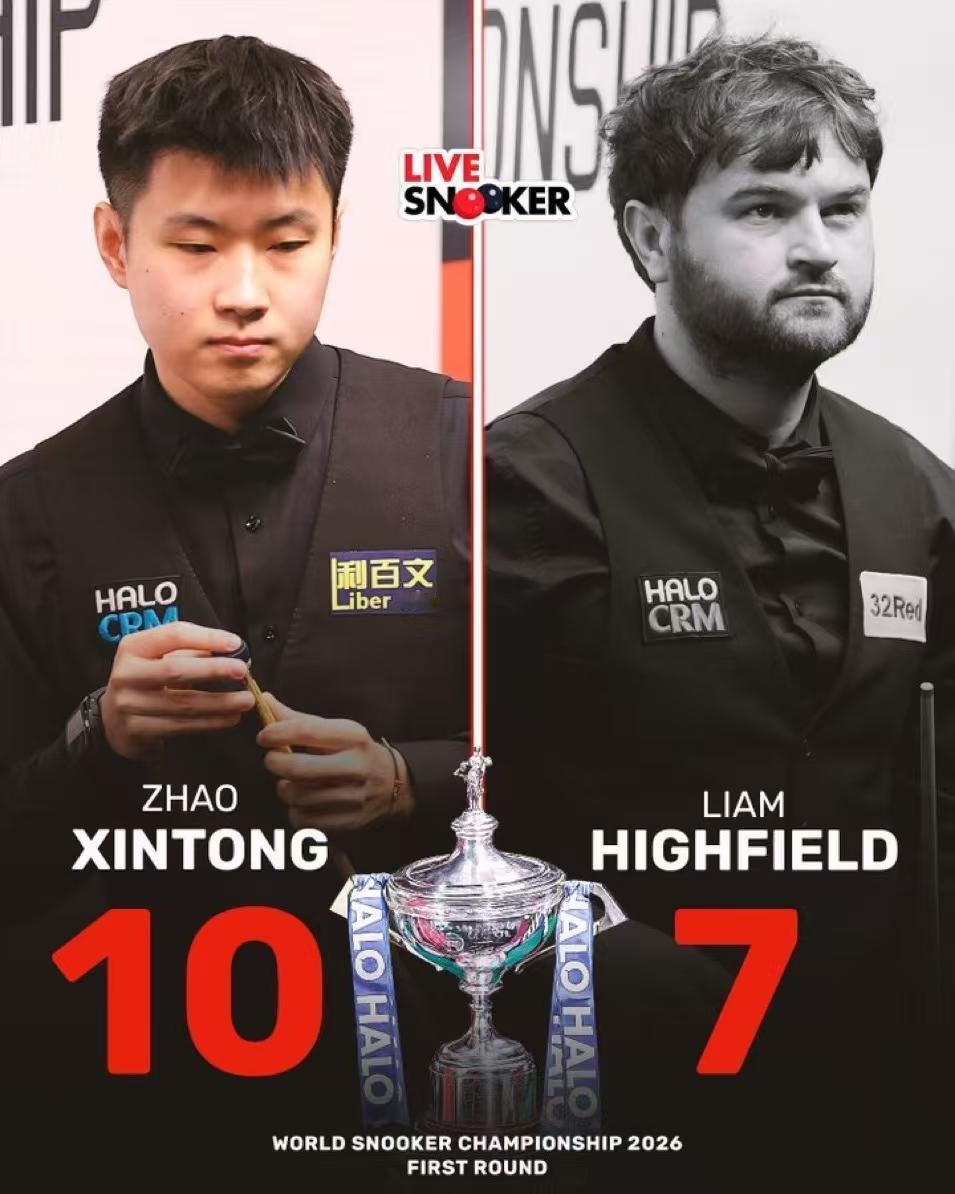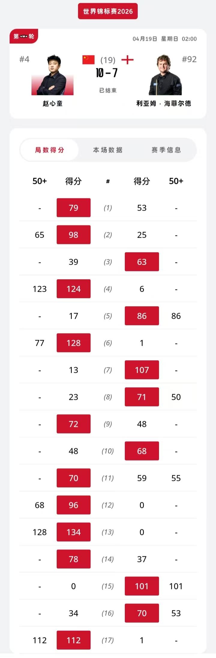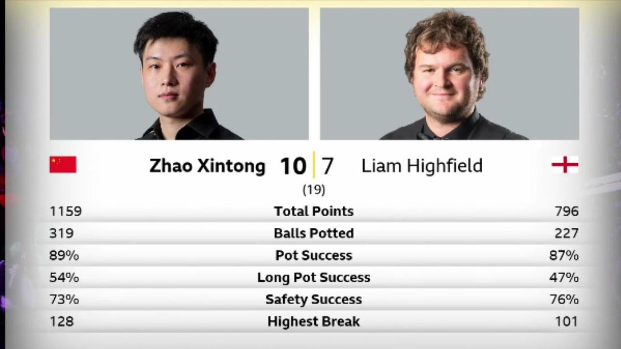 第15局,赵心童贴黑球失败,海菲尔德打出本次比赛首杆过百,扳回一局。第16局,赵心童长台进攻失败,后来又被长台钓鱼,海菲尔德再胜一局。第17局,双方缠斗,赵心童莽夫之魂燃烧,轰进去传球,打出单杆过百,拿下比赛。