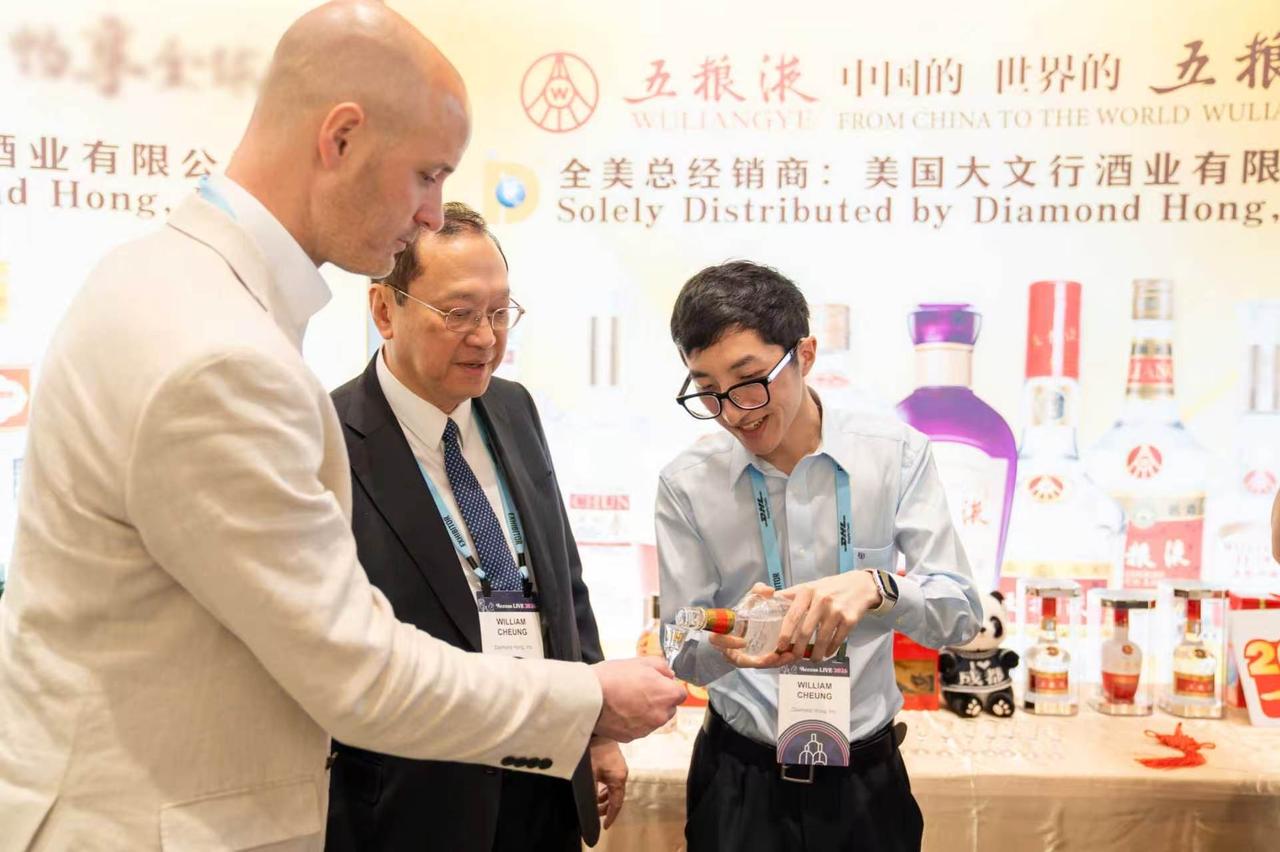 由美国大文行酒业作为美国总经销的中国名酒五粮液,在本次展会上表现亮眼,成为现场观众与业内人士关注的焦点之一。展位前人流不断,来自各国的采购商、侍酒师以及酒类爱好者纷纷驻足品鉴,对这款拥有千年酿造技艺的中国白酒表现出浓厚兴趣。