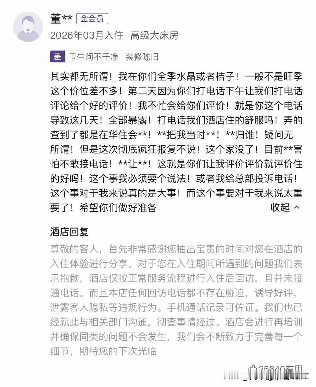 酒店明确表示,给董女士拨打回访电话,是按照行业正常流程操作,全程没有任何违规之处,既没有胁迫、诱导董女士给好评,更没有泄露任何客人的隐私信息。