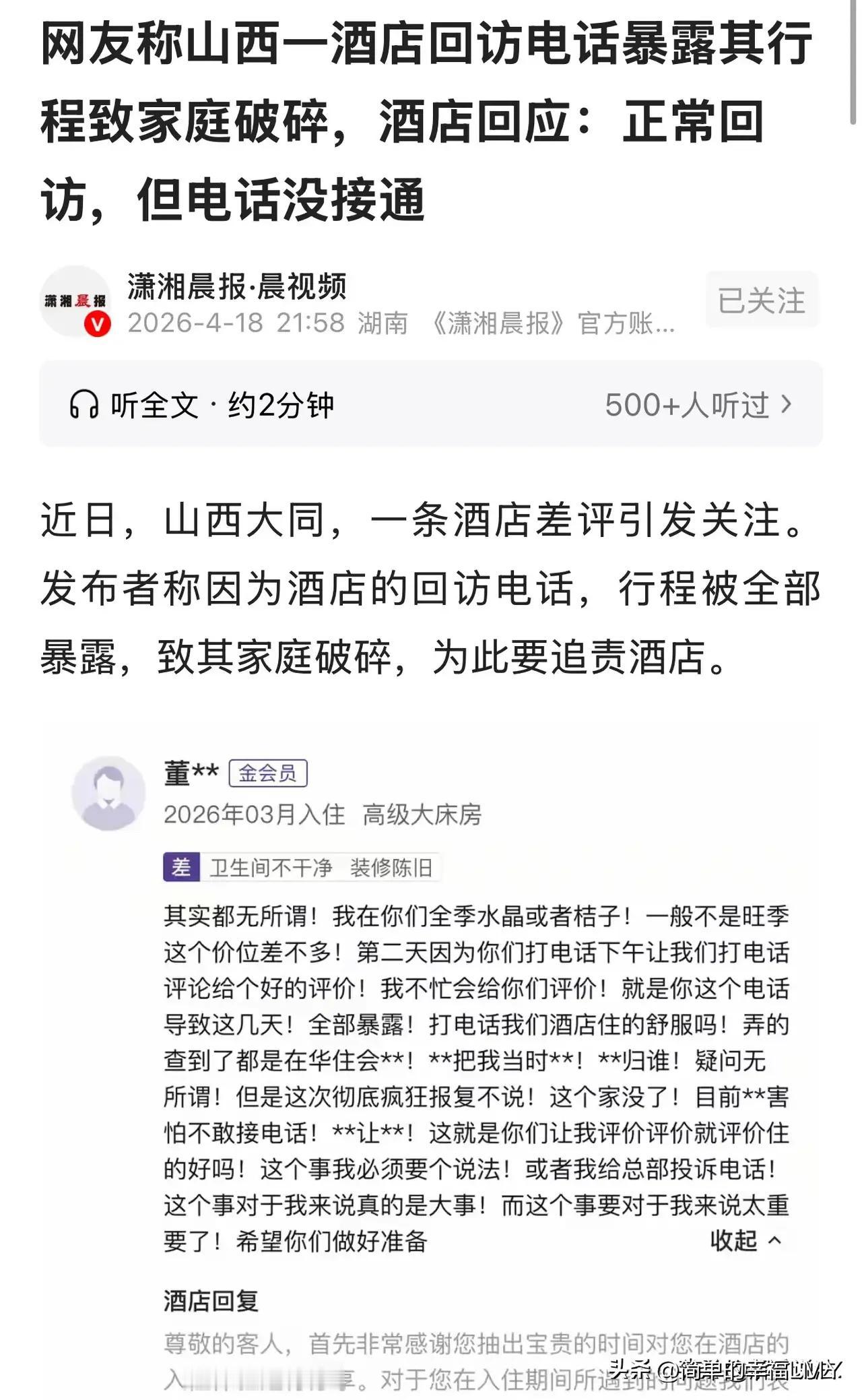 目前酒店已经将此事上报给领导,正在进一步妥善处理。其实整件事的是非曲直,明眼人一眼就能看明白。说到底,导致董女士家庭破碎、众叛亲离的根本原因,从来都不是酒店的回访电话,而是她自己婚内出轨的错误行为。
