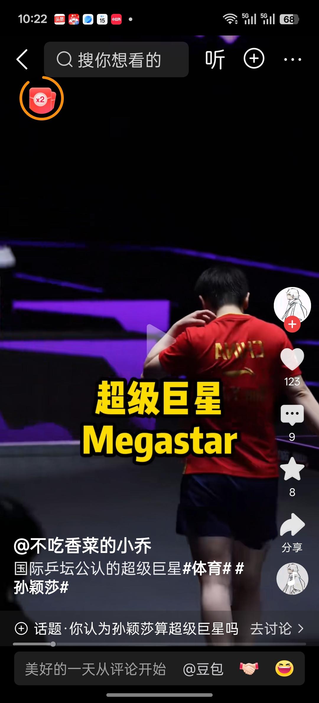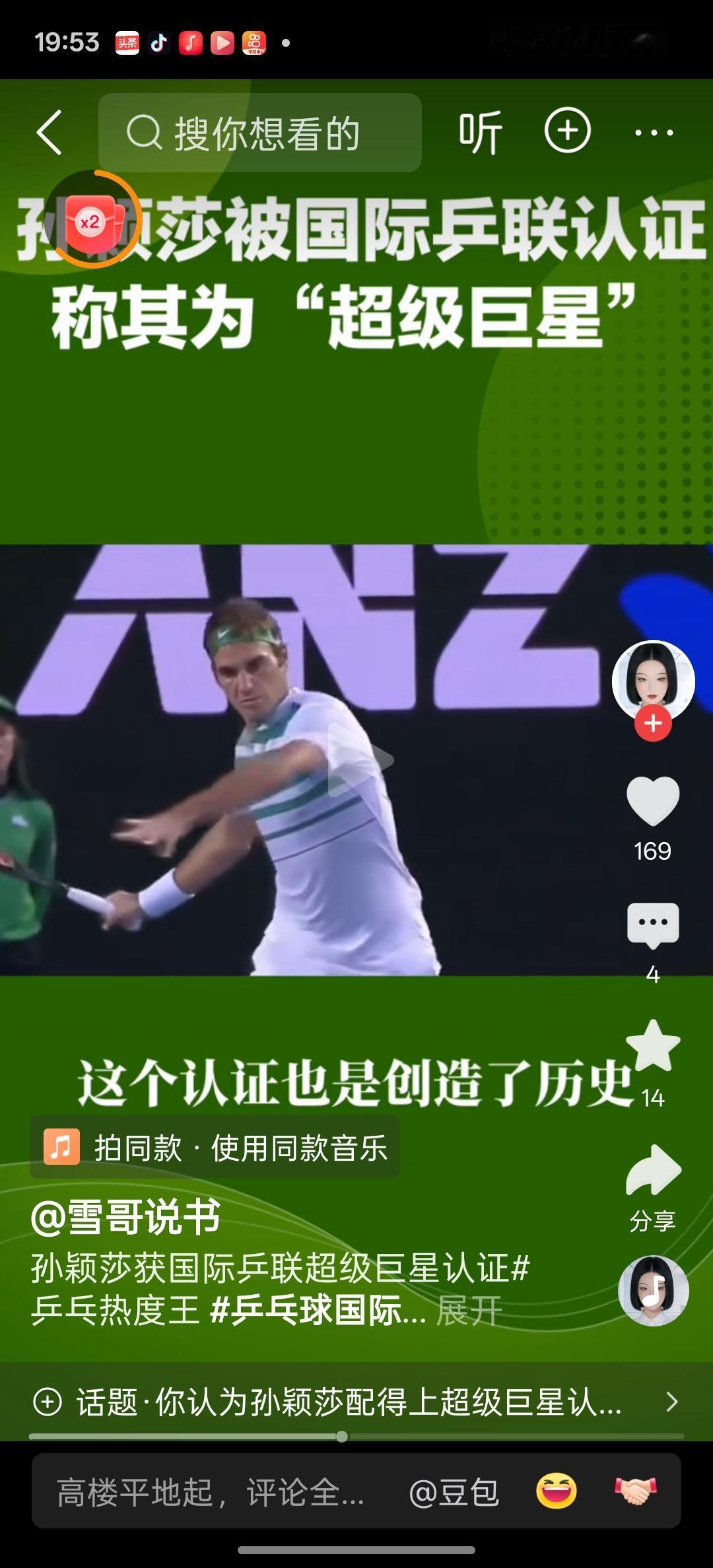 孙颖莎日前国乒选手孙颖莎被世界乒联标注为“超级巨星”引起了亿万关注国乒关注孙颖莎人们的一致赞誉,可以说孙颖莎在创造世界杯三连冠历史后又一次创造了我国体育运动的历史,孙颖莎能够成为比肩篮球超级巨星乔丹,足球超级巨星梅西,网球超级巨星费德勒的乒乓球超级巨星,这份殊荣是对孙颖莎在乒乓球赛场上取得优异成就的肯定,也是对孙颖莎在乒乓球运动的发展和巨大商演价值的肯定,因为纵观世界上各项运动项目能够取得巨大成功都离不开巨星的加持,这就是超级巨星价值所在,乒乓球作为我们的国球,可谓人才济济,所获荣誉无数,但是能够被世界乒联加冕为超级巨星称号的的只有孙颖莎,真是:自古燕赵多壮士,今朝莎莎胜儿郎。祝贺莎莎。祝贺国乒。
