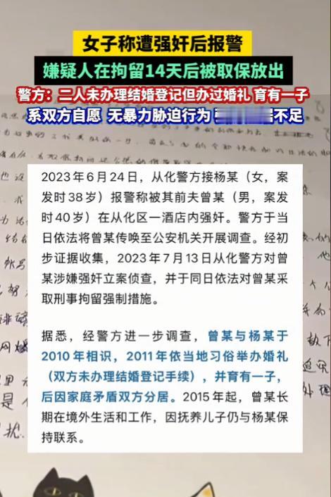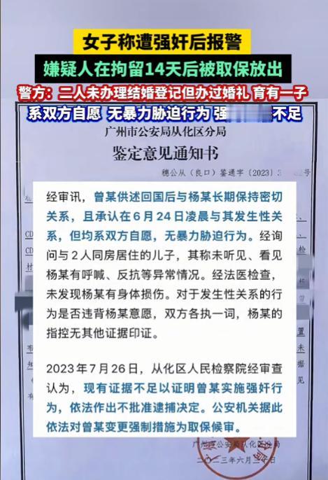 6月24号凌晨,儿子睡着了。曾某和杨某发生了关系。当天他们回到广州白云区的家里后,杨某突然报警,说被曾某强奸了。
