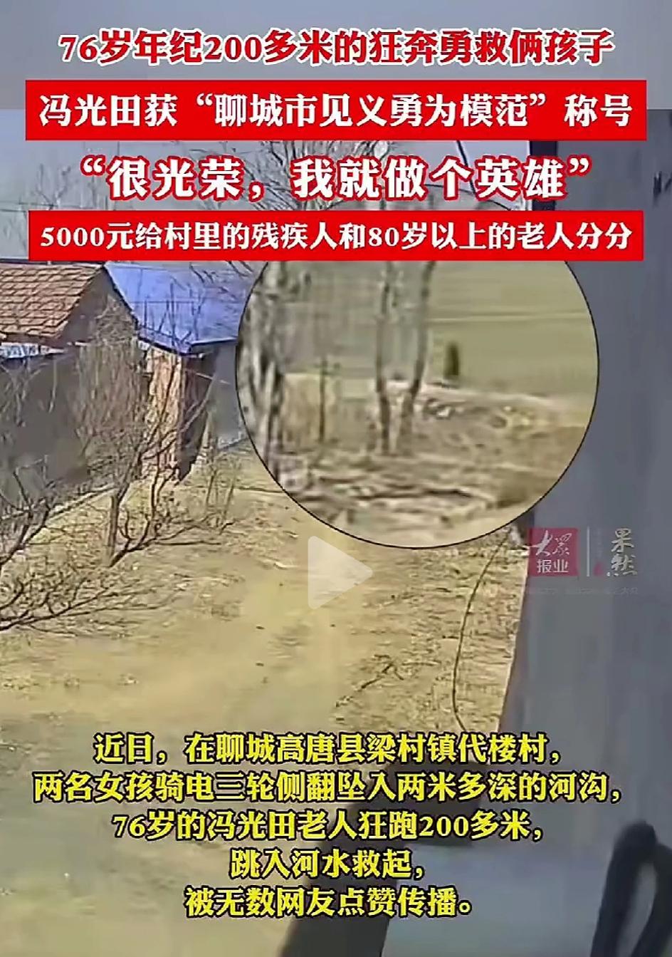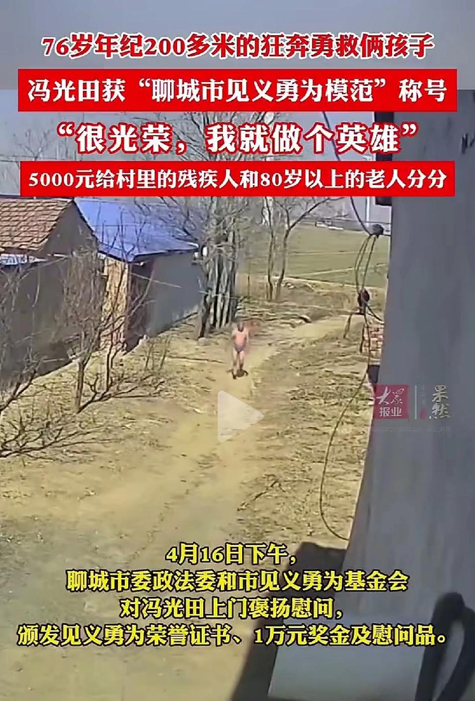 冯光田老人被评聊城市“见义勇为”奖奖金5000块钱,他把5000块分给村里80岁及以上的老人和残疾人。