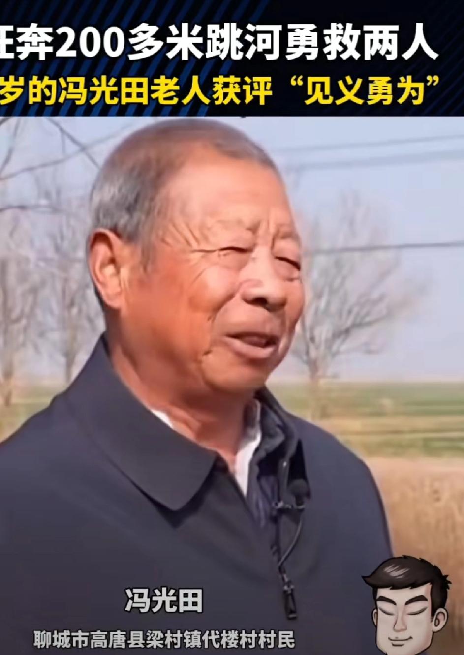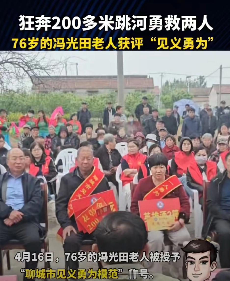 76岁老人狂奔200多米,下河救出两个落水女子。近日在聊城高唐县梁村镇代楼村,两个女孩骑电动三轮车侧翻到2m多深的河沟里,76岁的冯光田老人看到了,快步急冲200m,毫不犹豫的跳下河岸,把两个落水女子捞上来了。他自己的衣服都湿透了。两女子上门 叩谢救命之恩。被救女子家人说,救了孩子的命等于救了俺一个家,老人说:必须想办法救上来。