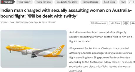 说白了,就是万米高空的密闭机舱里,一名52岁印度男子当着满舱乘客的面,对邻座女旅客实施了强奸,还没等航班落地就被澳大利亚警方盯上,落地直接逮捕,说出来谁都得懵圈。