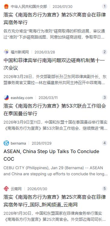 当然,光靠硬碰硬肯定不够,中国在南海的策略其实是软硬兼施。硬的一手是维权执法,软的一手则体现在“南海行为准则”磋商上。这事儿进展很快——2025年7月,各方完成了COC磋商的三读。2026年1月30日,中国和东盟国家在菲律宾宿务开了高官会,审议通过了磋商路线图,大家一致同意要加快进度,争取早日落地。2026年3月,又在泰国曼谷开了联合工作组会继续推进。