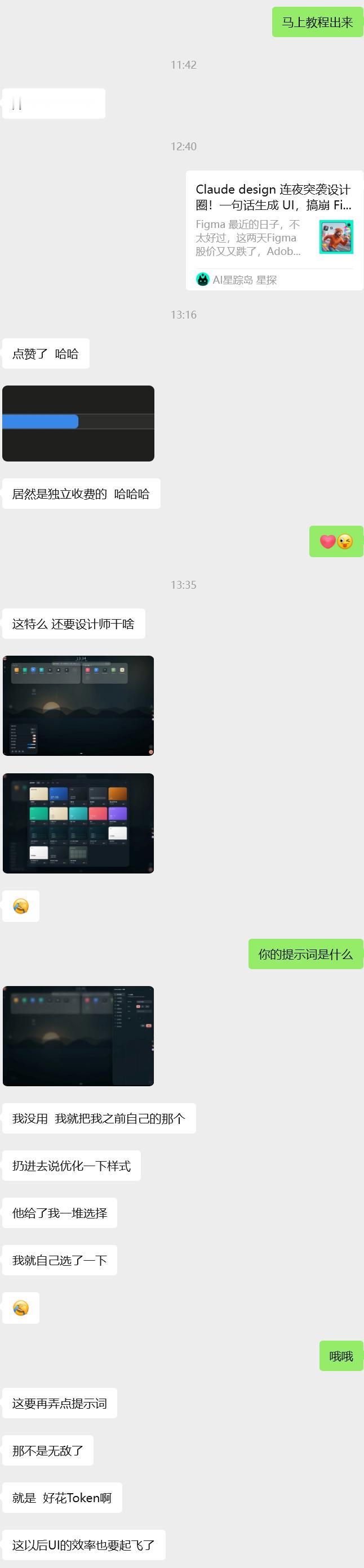 程序员朋友发来的,给他看了今天我们出的Claude design教程后。他感叹道:“这以后UI的效率也要起飞了!”他觉得不可思议:“无敌了!就是好花Token啊。”