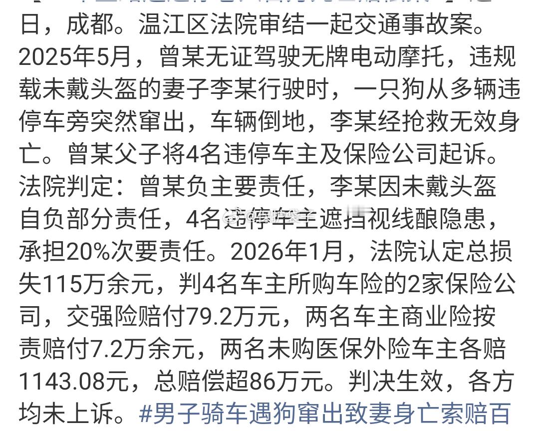 4车主路边违停卷入百万死亡赔偿案算了好久,最后才发现这笔79.2是不算在应该承担的20%里的,被绕晕了。但是,能说说这突然窜出来的那条狗么,这应该是最直接原因吧? 如果是有主的,应该不难寻找。 如果是流 浪狗,造了这么大的孽,赶紧收了吧。 乱停车要背责,乱养狗就不用么?袋子时评