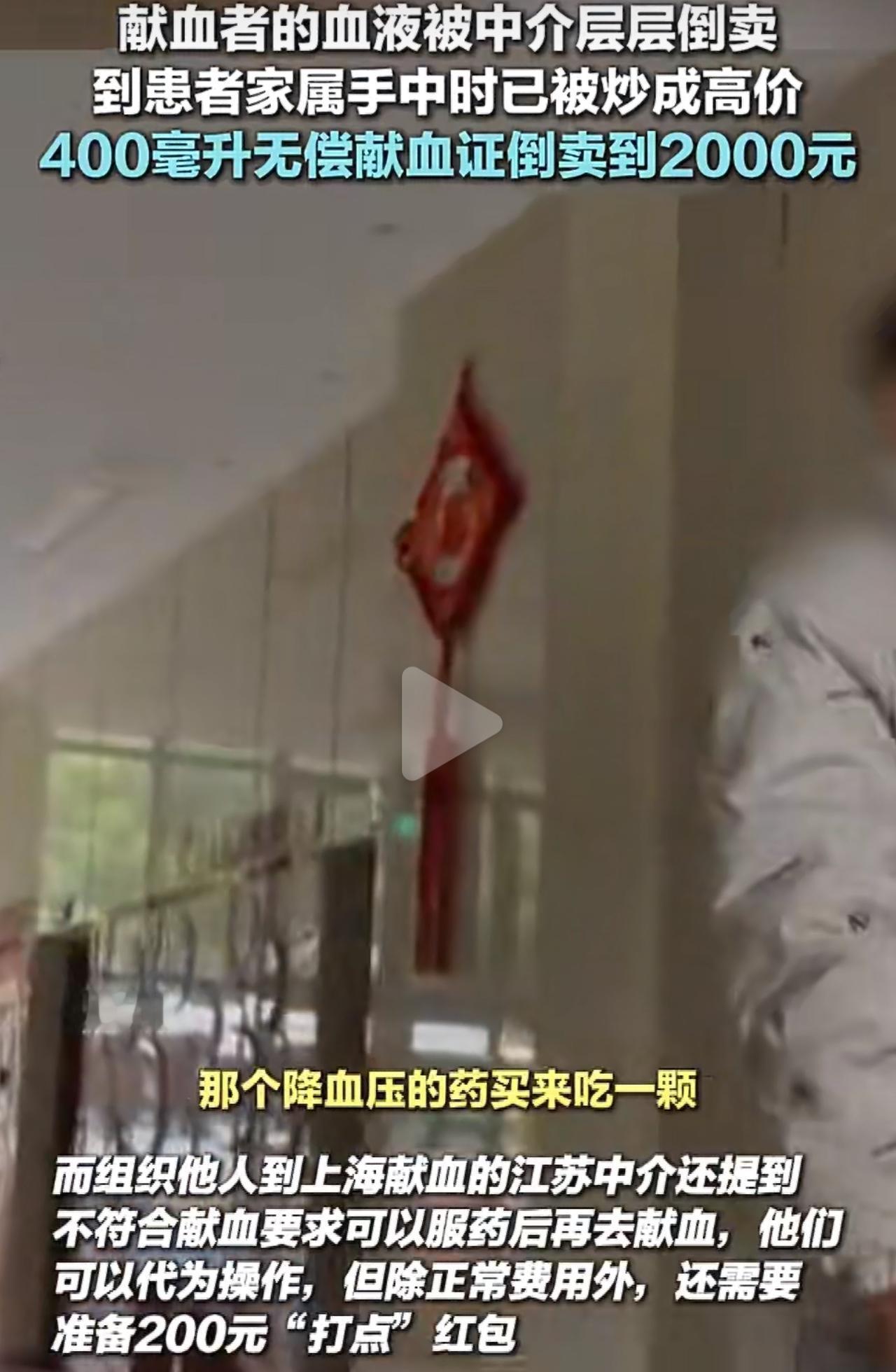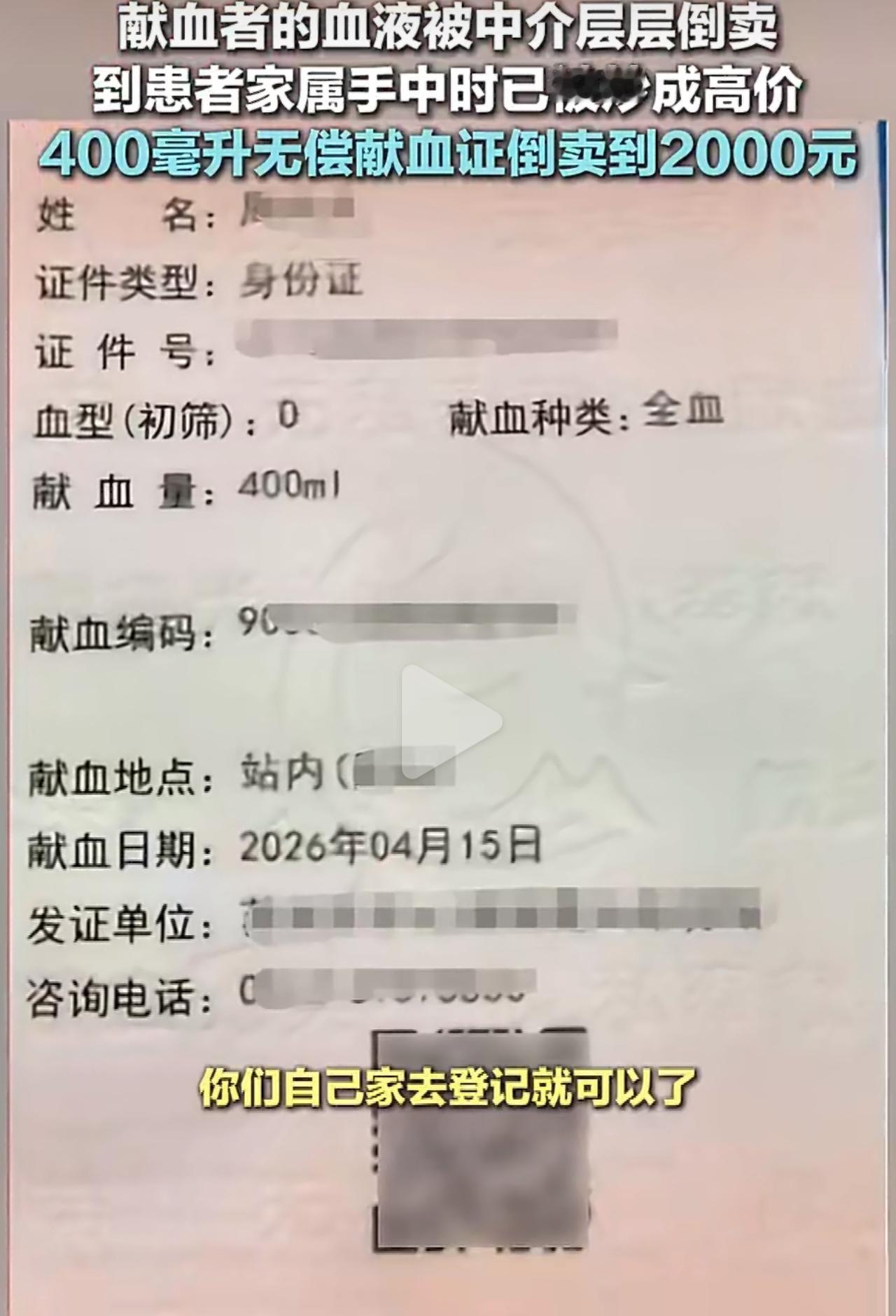 有三甲医院医生实名爆料,现在血库一直缺血,加上监管有漏洞,直接催生了献血证倒卖的黑产业链。中介就花400块,找务工人员献血换献血证,转手就卖给等着做手术救命的家属,直接卖到2000块,这差价赚得实在太黑心!