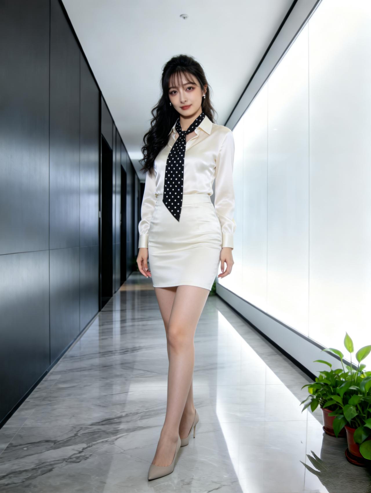 简约大气的米白色缎面衬衫, 搭配一条黑底白点波点细丝巾, 复古柔美的白领都市职场