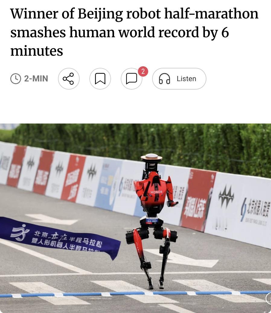 外媒:北京第二届机器人半程马拉松周日举行,荣耀公司开发的人形机器人"闪电"以50分26秒夺冠,比人类男子半程马拉松世界纪录57分20秒快了6分多钟,比当天最快的人类业余选手快了约17分钟。