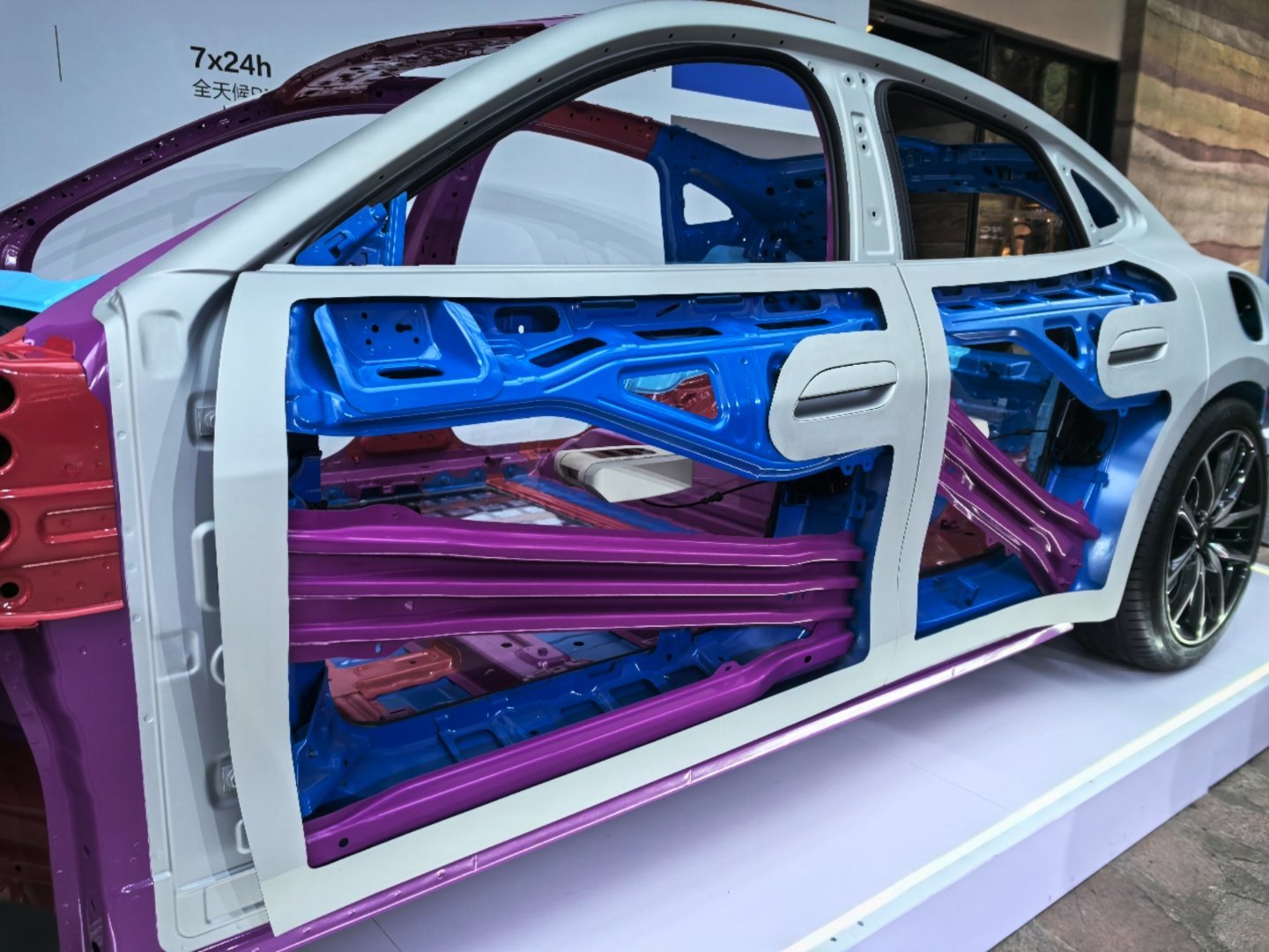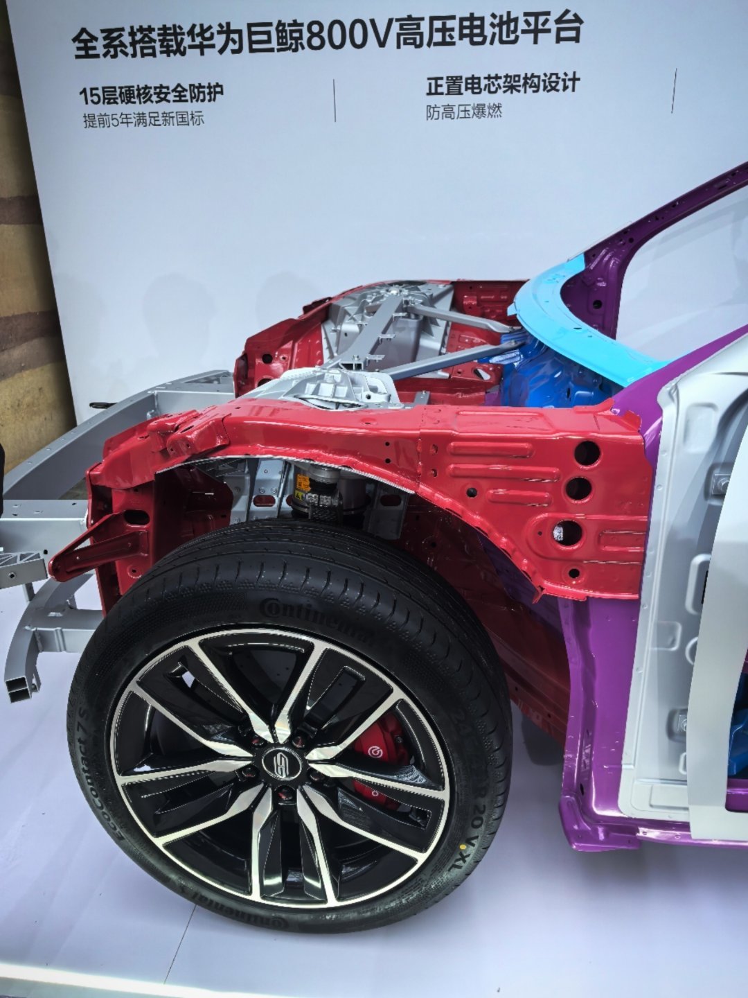 车身用料:高强度钢+铝合金占比高达91%,全车14处关键部位采用2000MPa热成型钢加强(白车身紫色钢材),这种钢材常用于核潜艇和航天领域,可承受5.8倍车重的车顶抗压。