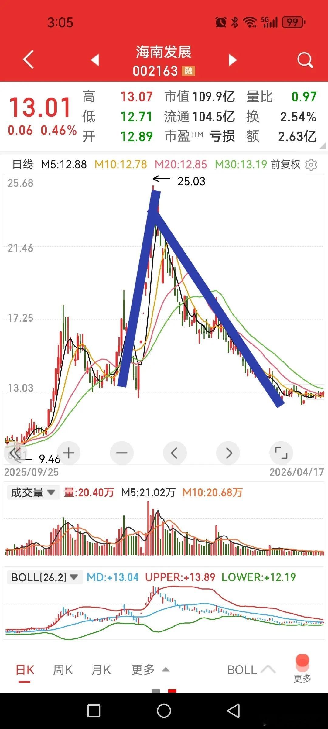 第二只,海南发展,关税战开打最低6.2元,12月29日达到最高价25.03元,净涨幅高达3倍,至今股价回落到13.01元也是接近腰斩。最诱惑人的是自贸港闭关后还连拉涨停,一路回调至今连个反弹都不给,关门打狗。