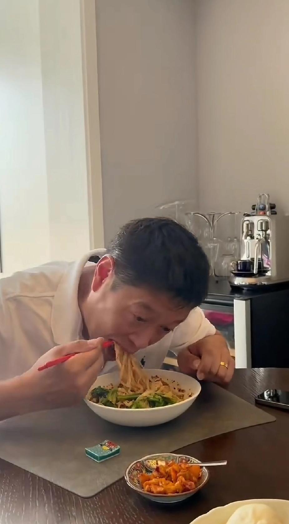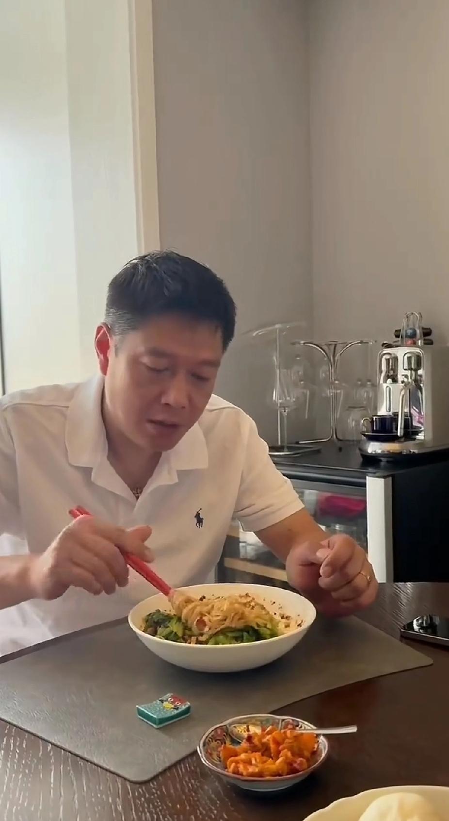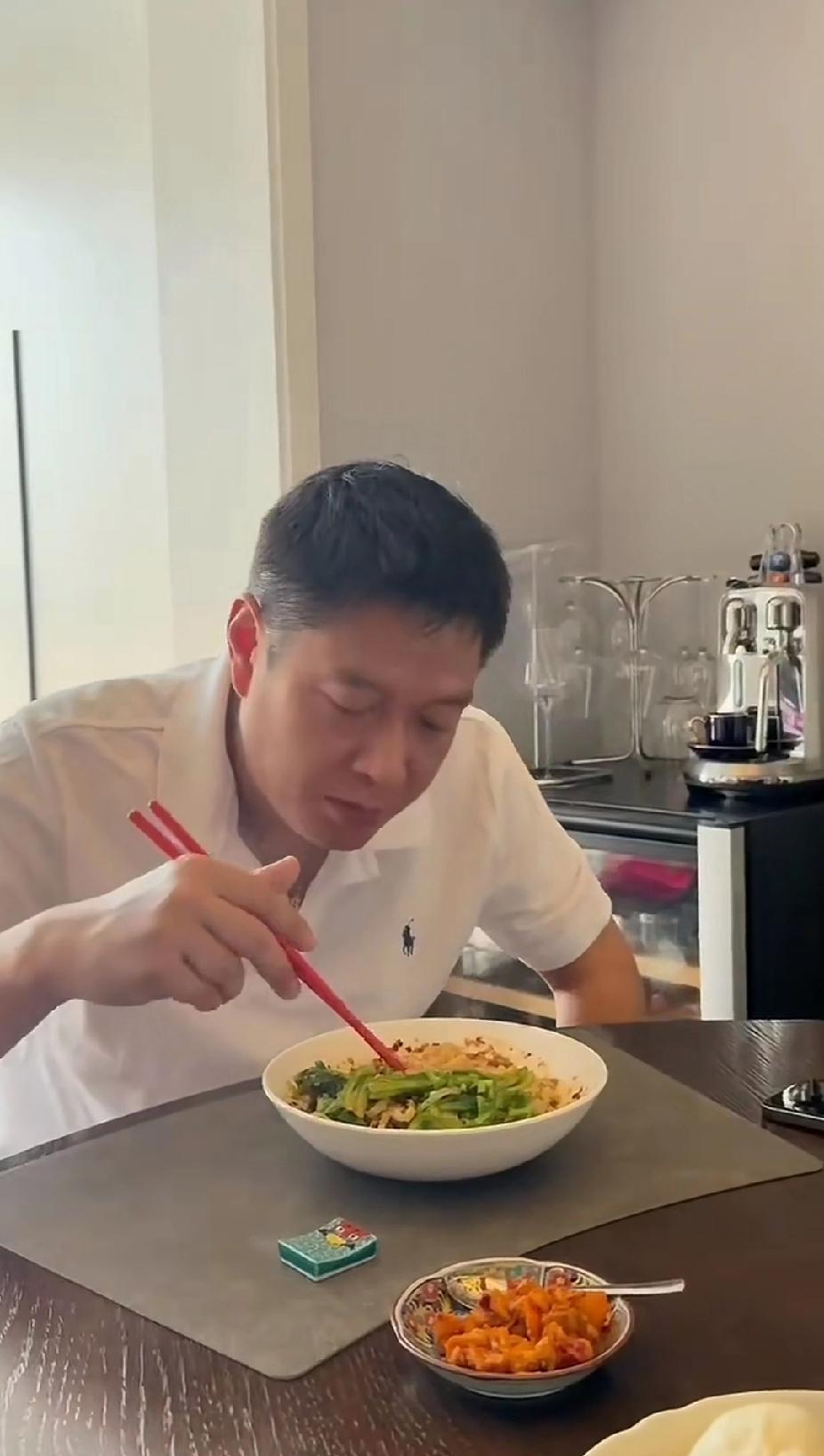 没有赛场边运筹帷幄的样子,就穿着件简单的白Polo,安安静静坐在那里吃面,吃得那叫一个香。可越看越觉得可爱,他夹面的动作真的有点不协调,红筷子捏在手里,带着点“笨笨的认真”,跟赛场上的沉稳完全是两个画风。