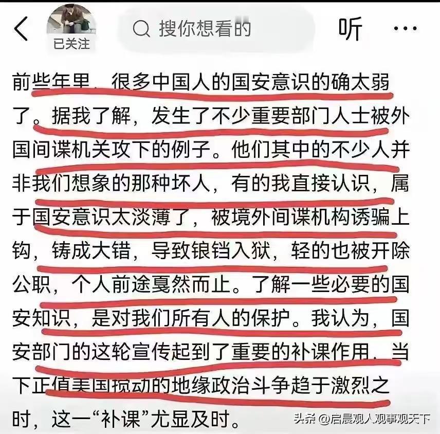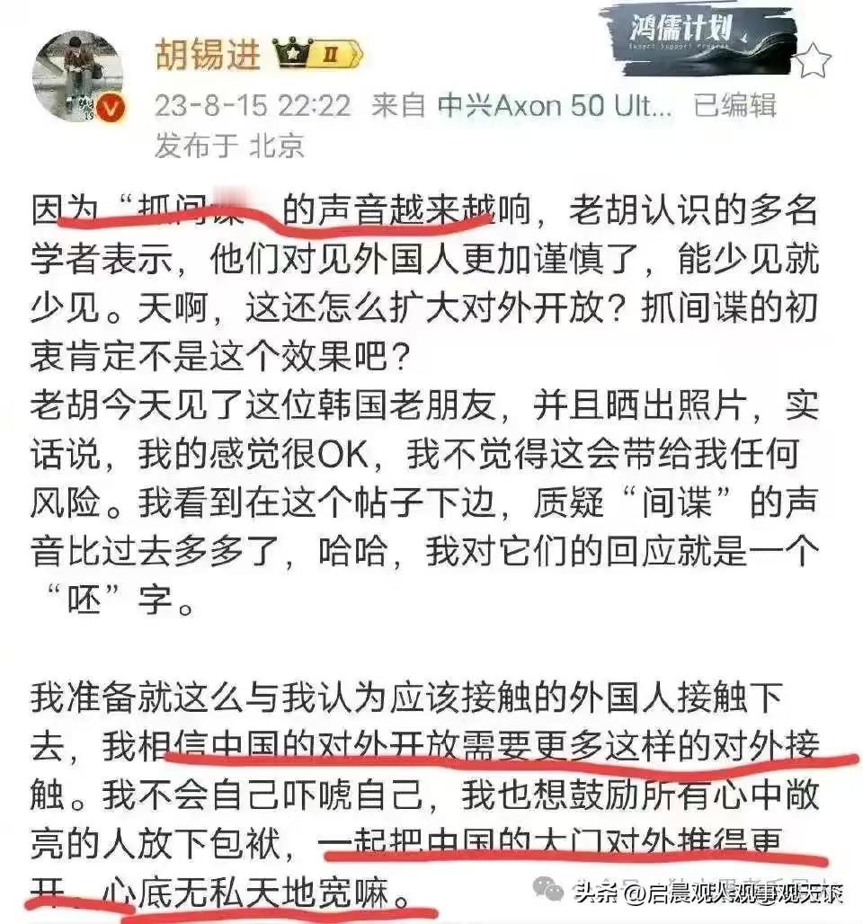 胡锡进的言论,反映了一种典型的“精英式傲慢”和对群众力量的不信任。他习惯于从“理中客”的角度去分析问题,却忽略了国家安全这场没有硝烟的战争,从来就不是少数人的游戏。