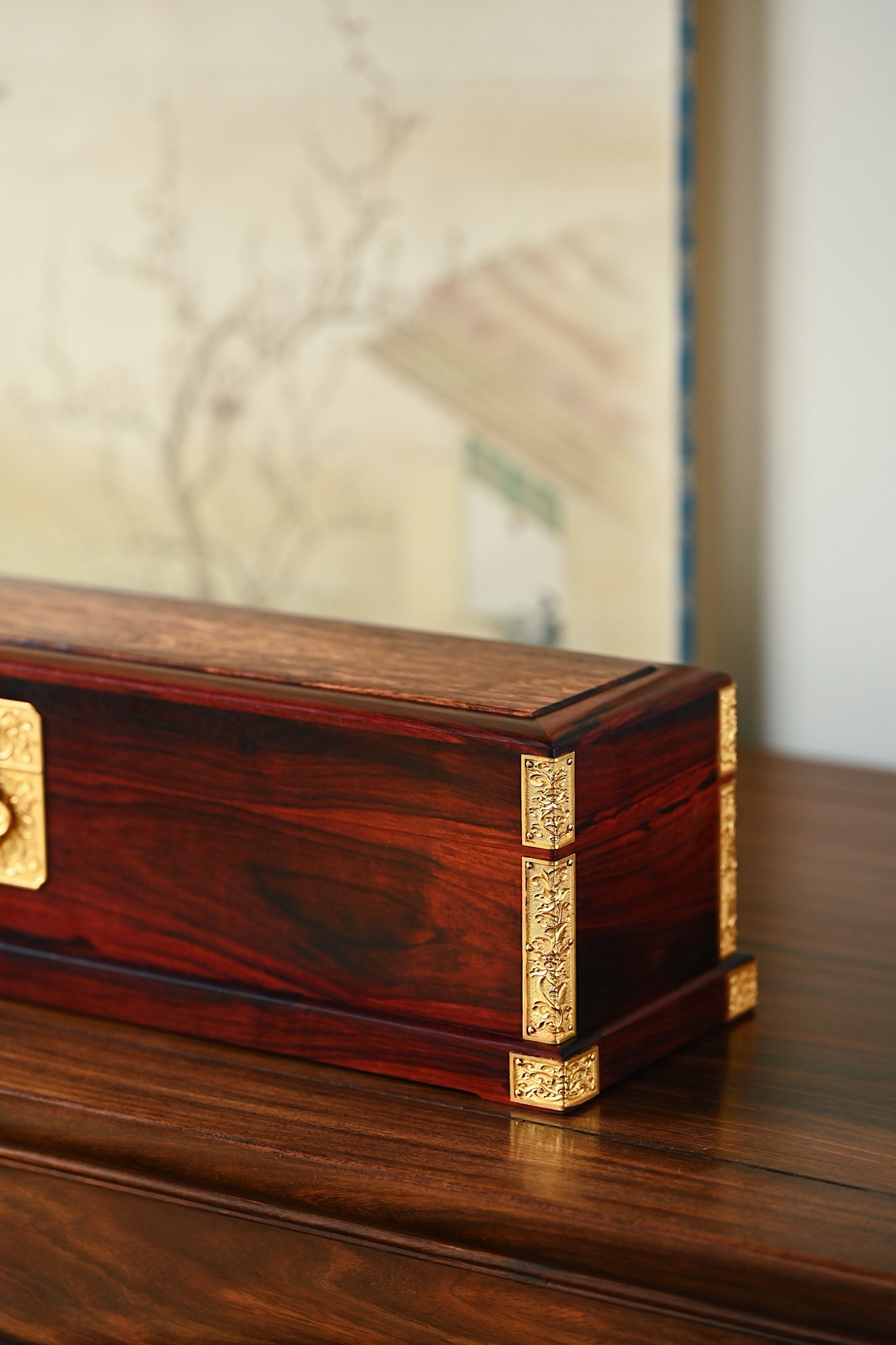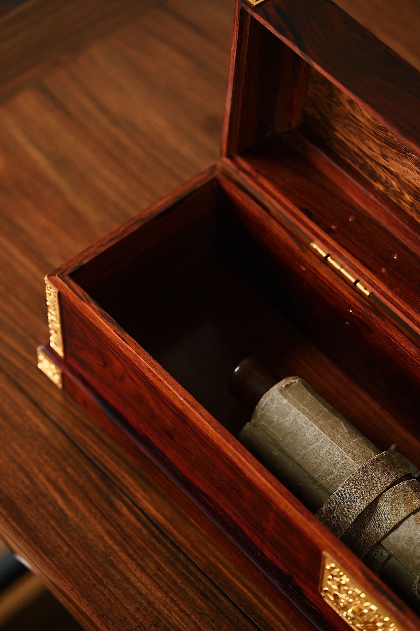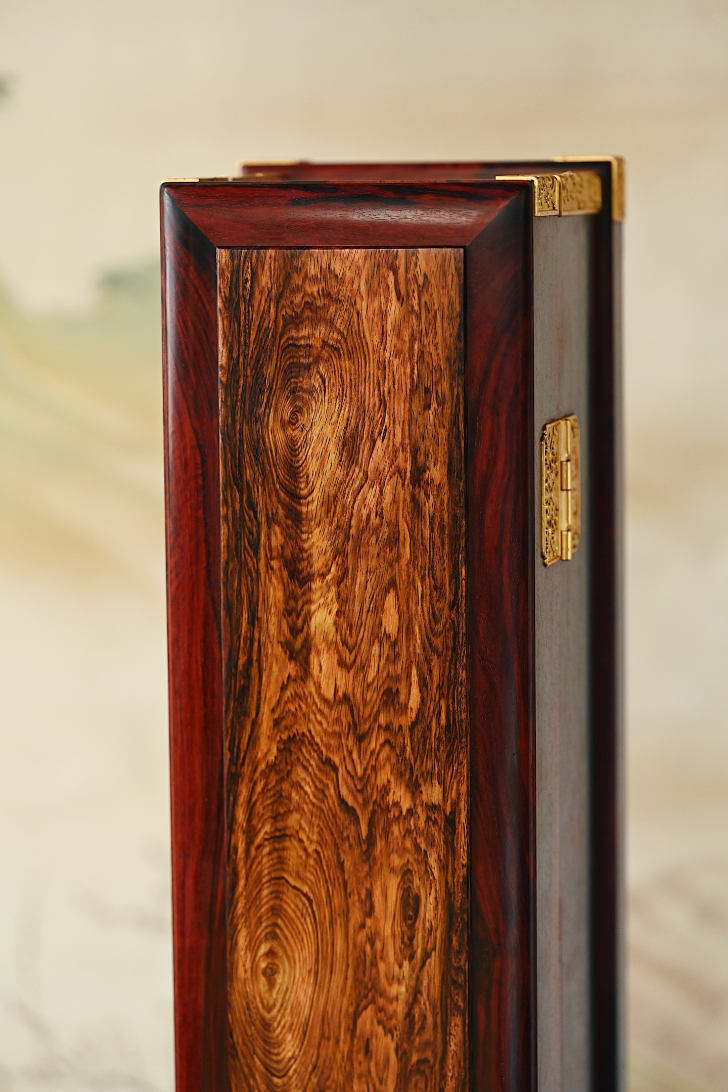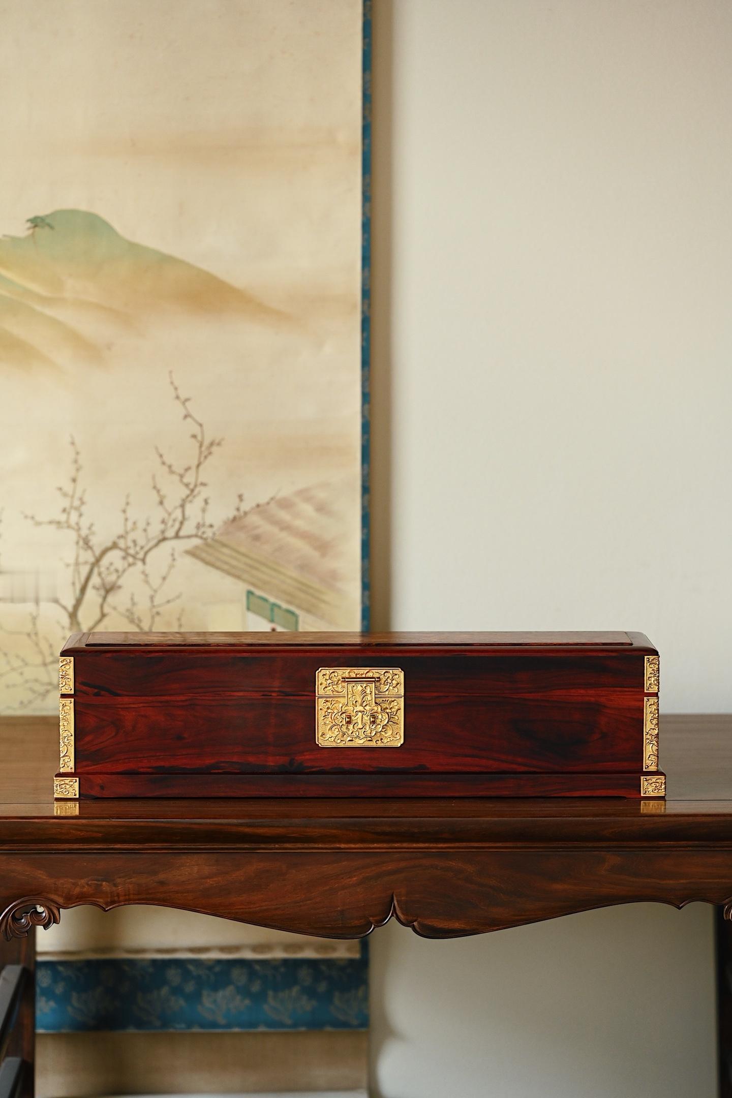 以小叶紫檀为盒,沉穆端庄;以黄花梨独板为面,天然纹理如山水画卷,鬼眼流转,鎏金铜扣点缀其间,古雅精致,开合之间,藏尽雅物。此盒可纳书画卷轴,可存文玩珍品等,方寸之间,见藏物之趣。