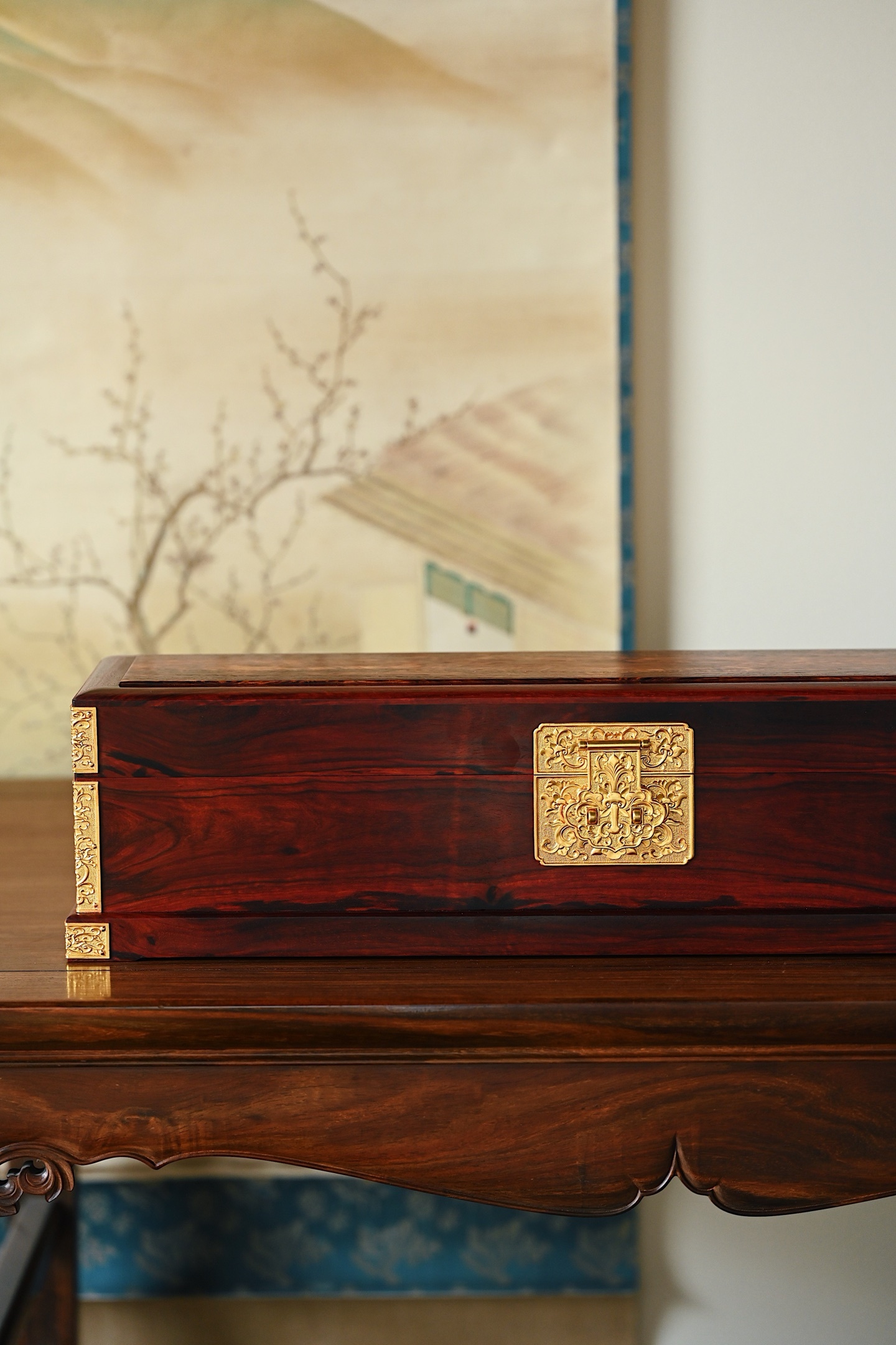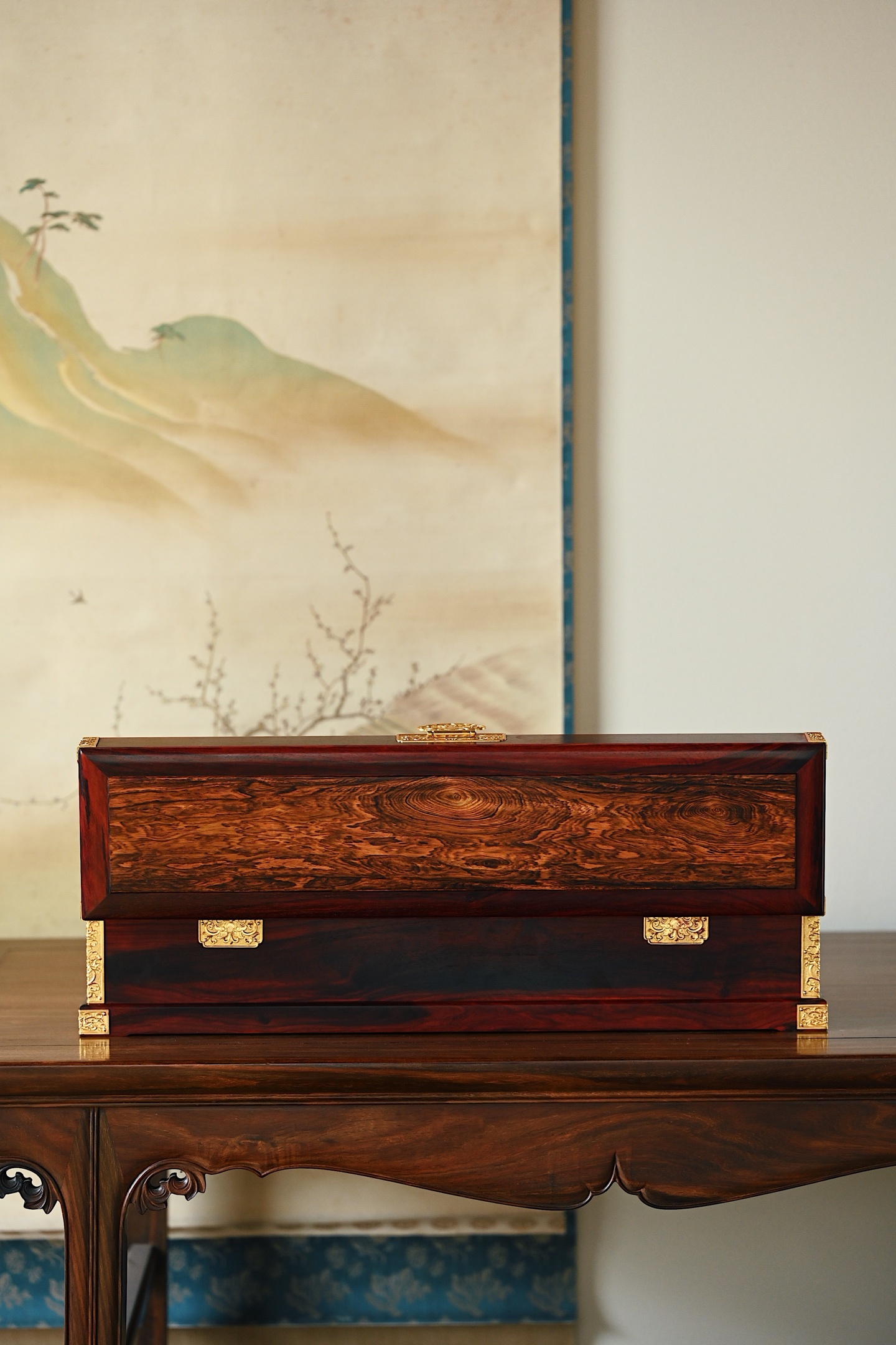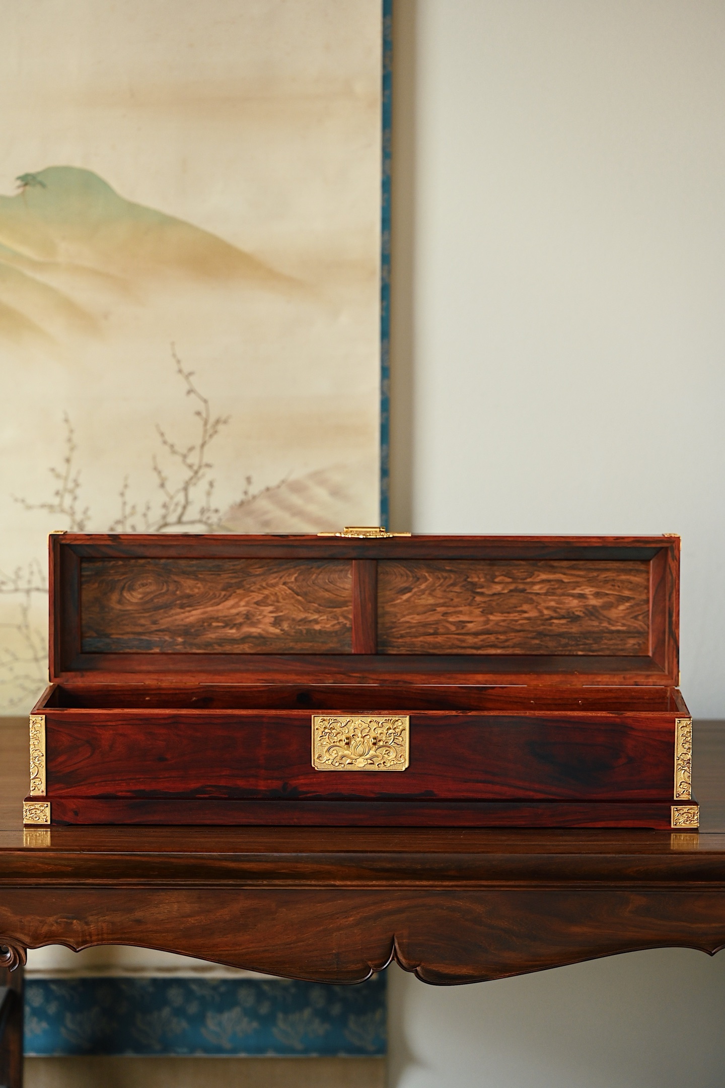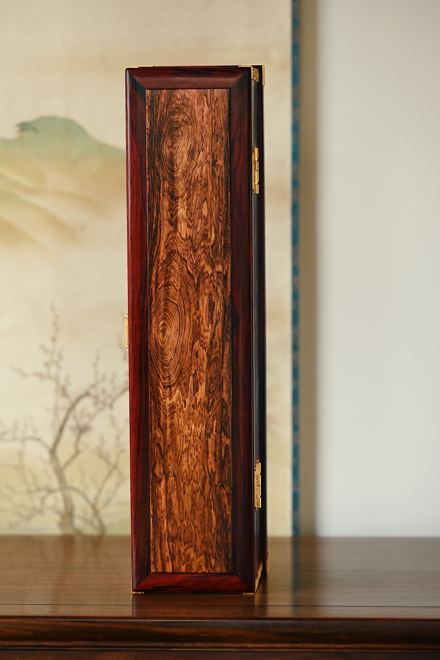 以小叶紫檀为盒,沉穆端庄;以黄花梨独板为面,天然纹理如山水画卷,鬼眼流转,鎏金铜扣点缀其间,古雅精致,开合之间,藏尽雅物。此盒可纳书画卷轴,可存文玩珍品等,方寸之间,见藏物之趣。
