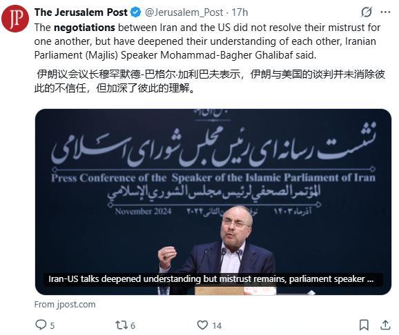 实际上,伊朗议长卡利巴夫讲得很清楚,谈可以谈,前提是地区停火要推进,特别提到黎巴嫩。