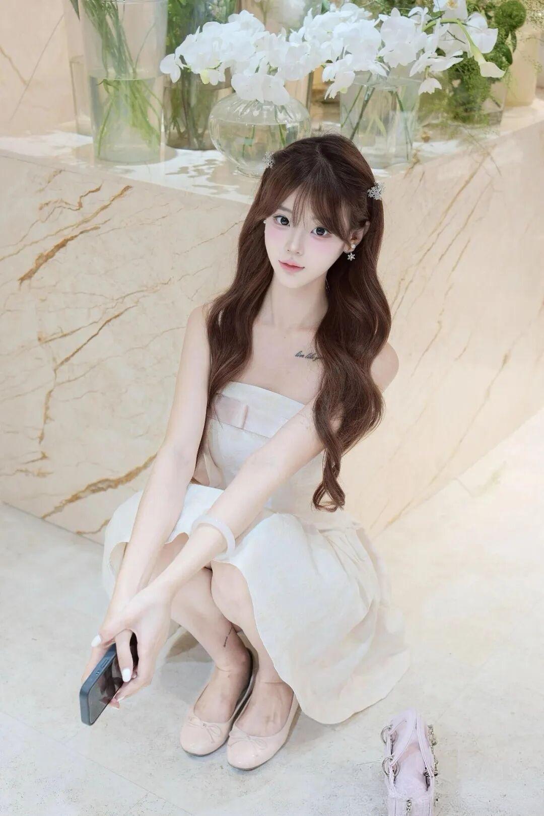 蹲姿特写:蹲在大理石背景前,裙摆散开,像一朵盛开的白玫瑰,眼神软乎乎的,少女感直接溢出屏幕。
