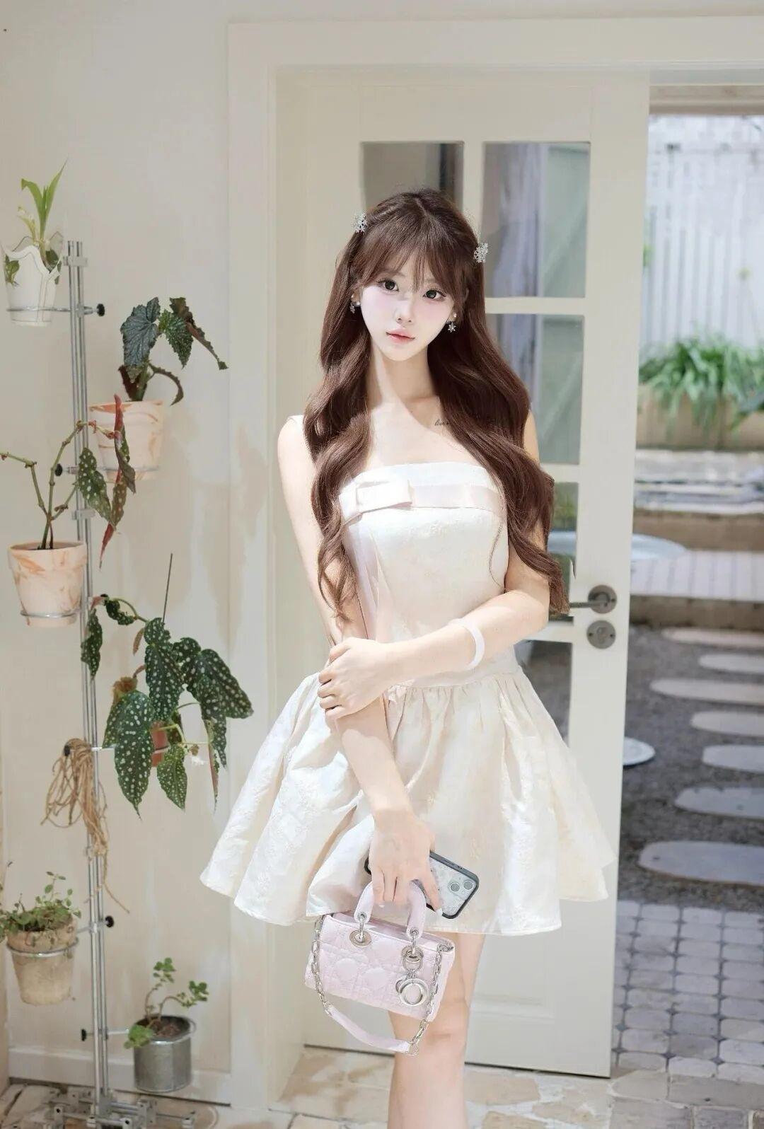 抹胸领口露出精致的锁骨和天鹅颈,胸口的缎面蝴蝶结温柔又减龄,自带法式甜美的氛围。