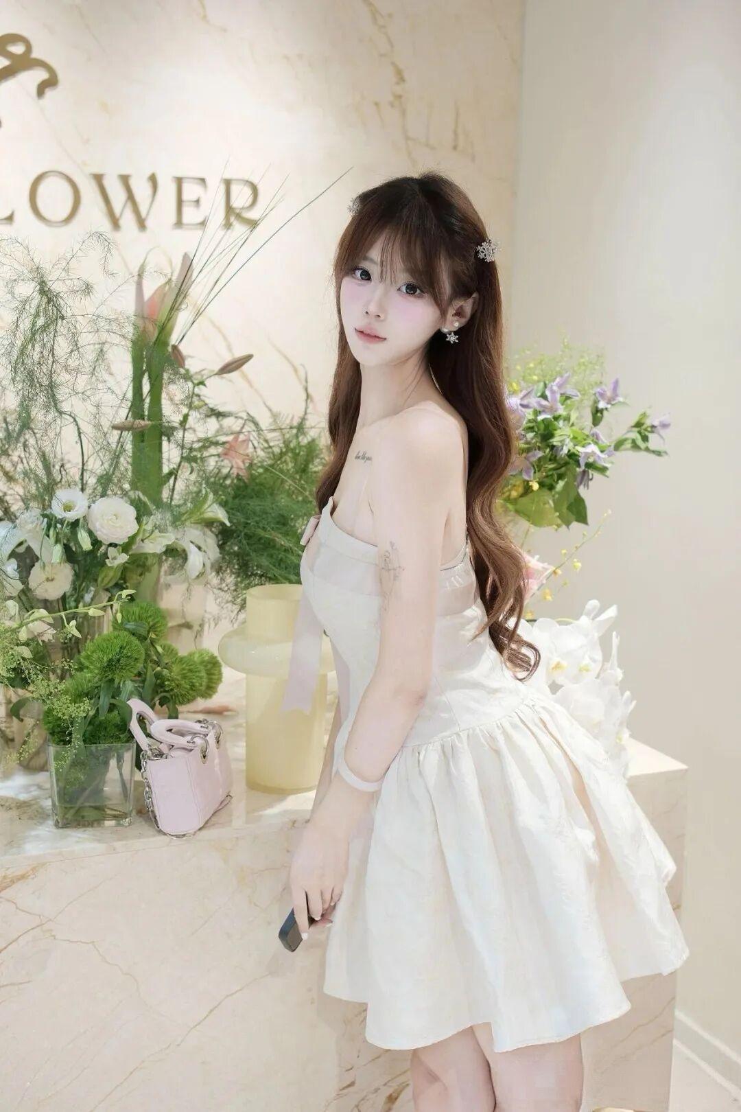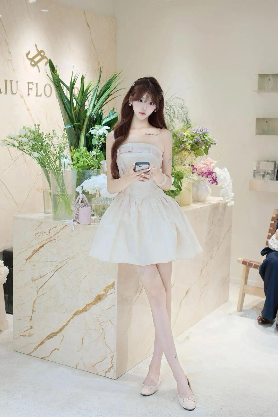 正面站立:她站在花艺背景前,双腿交叠,拿着手机的样子,软乎乎的像个被宠爱的小公主,温柔又灵动。