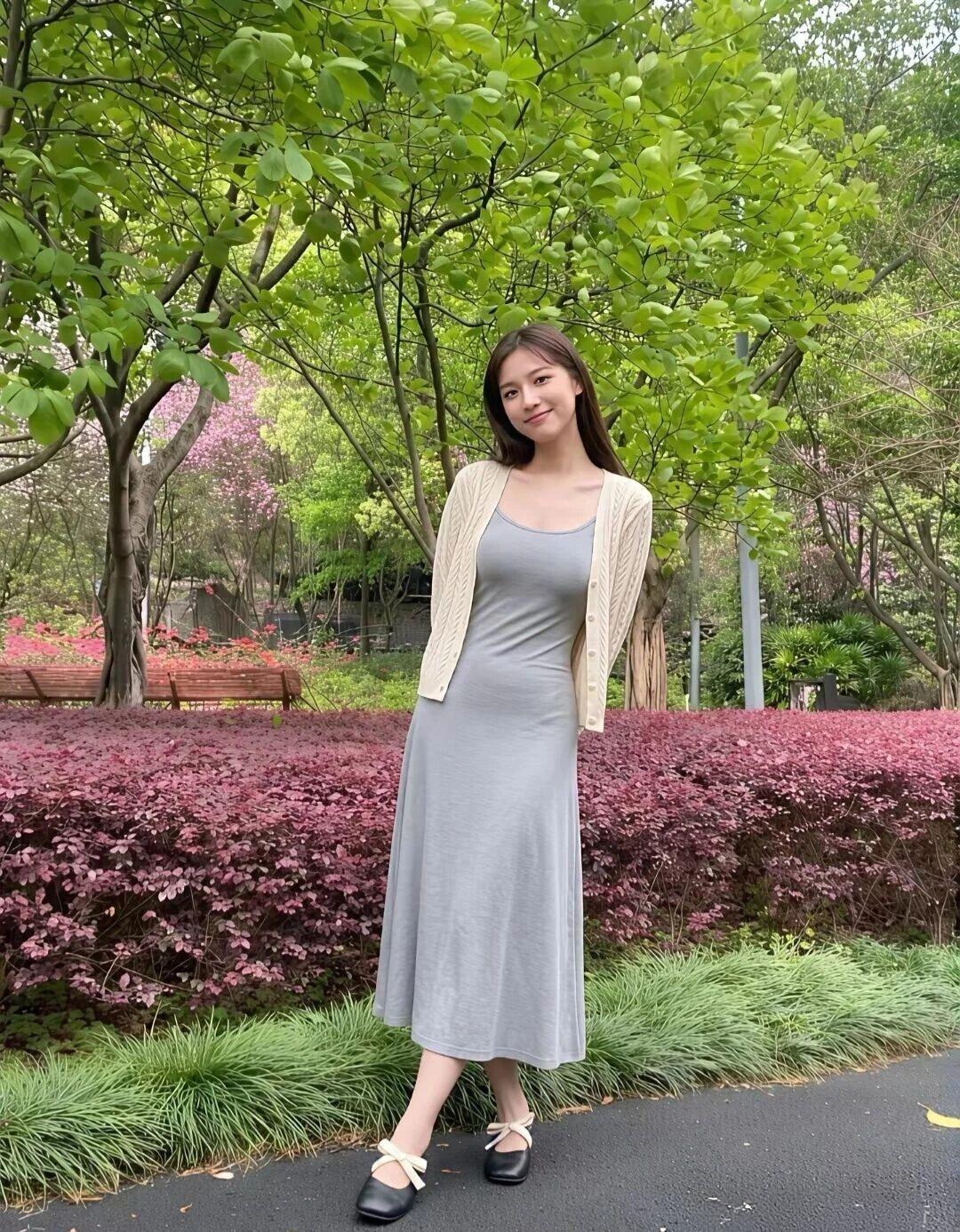 内搭是一件灰色针织吊带长裙,柔软的面料贴合身形,勾勒出温柔的曲线,长度到脚踝,自带慵懒的氛围感。