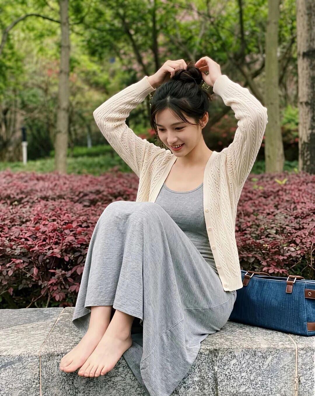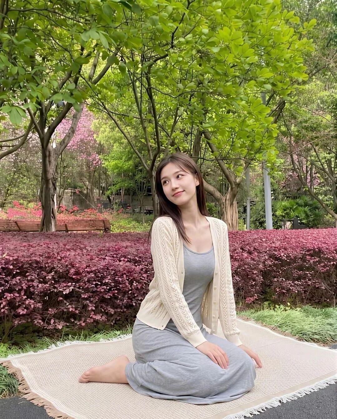 她时而坐在石阶上赤脚整理头发,时而在林间笑着蹦跳,每一个动作都透着松弛的自在感,完全没有刻意的拘束,整个人和春日的绿意融在一起,温柔又有生命力。