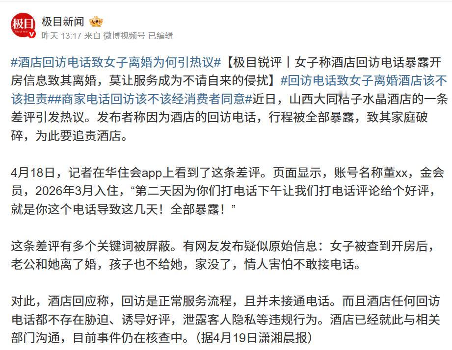 山西大一桔子水晶酒店因回访电话被自己的客户提交了差评,原因是因为酒店打电话给这位女子让给个好评,结果因为电话导致自己的行踪全部暴露!