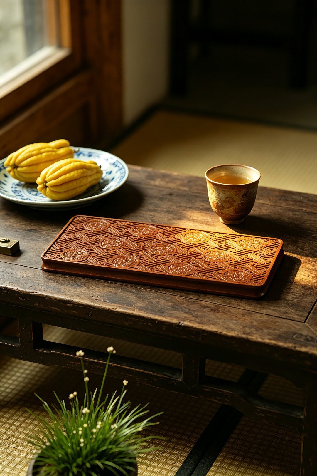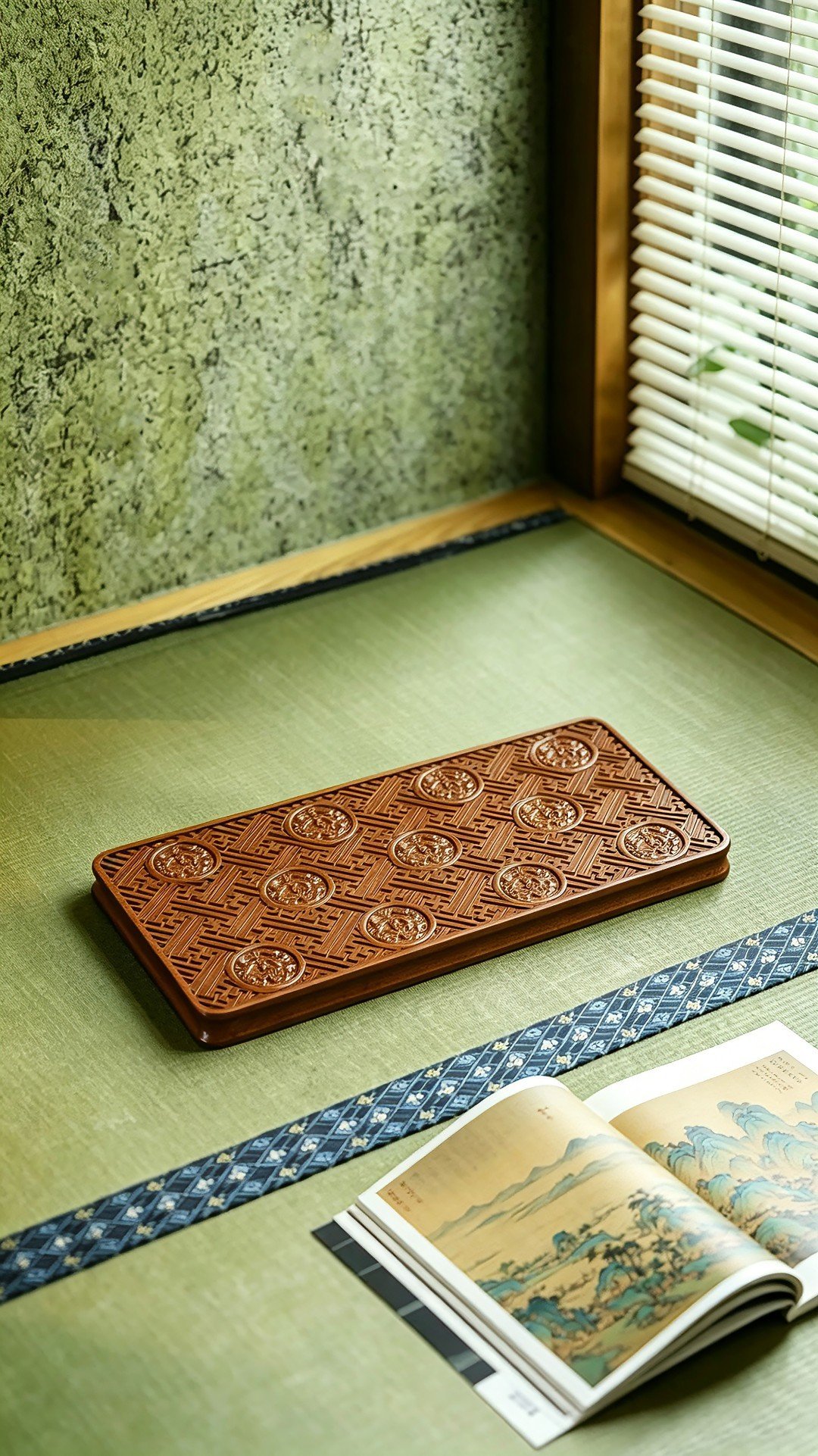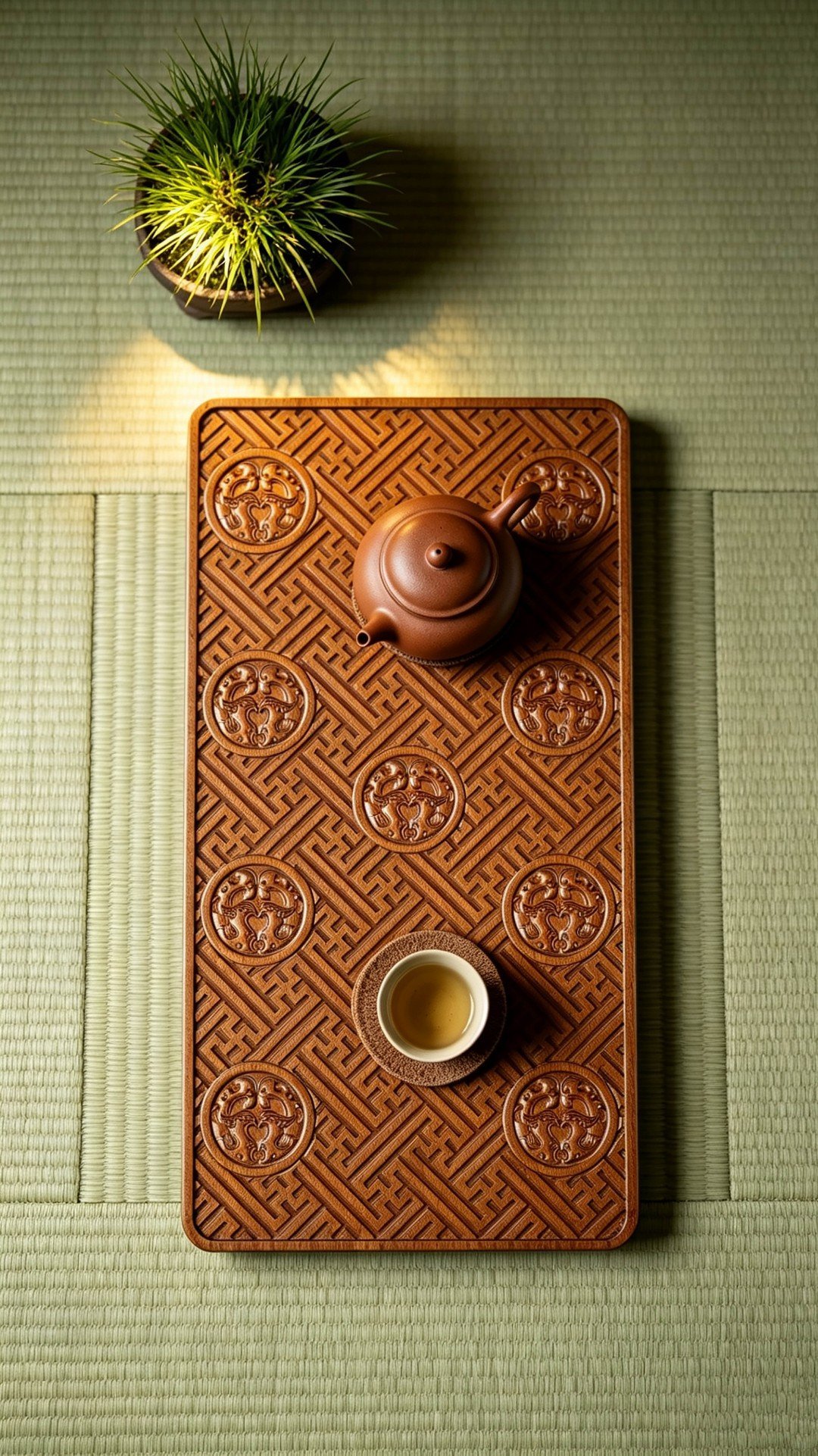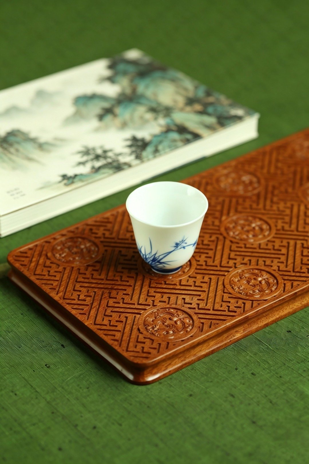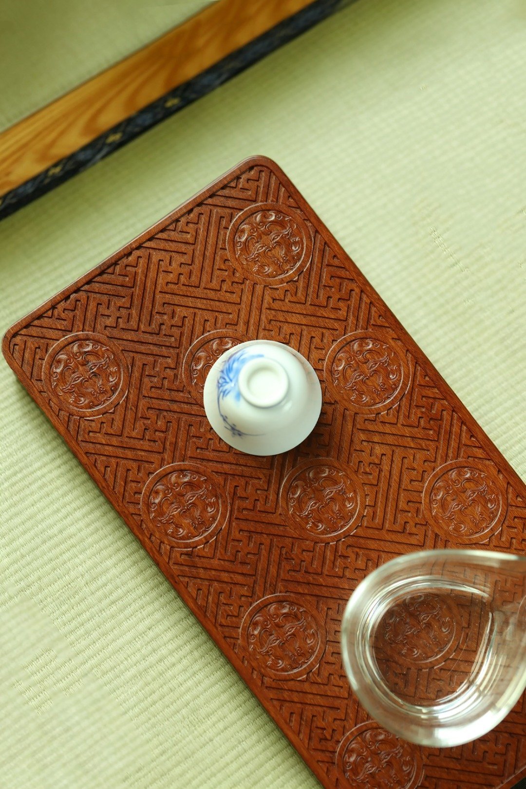 取材非洲酸枝整料雕成,满雕朱雀万字不断纹,寓意万寿无疆,富贵不断,置案头辅以茶事,风雅十分。
