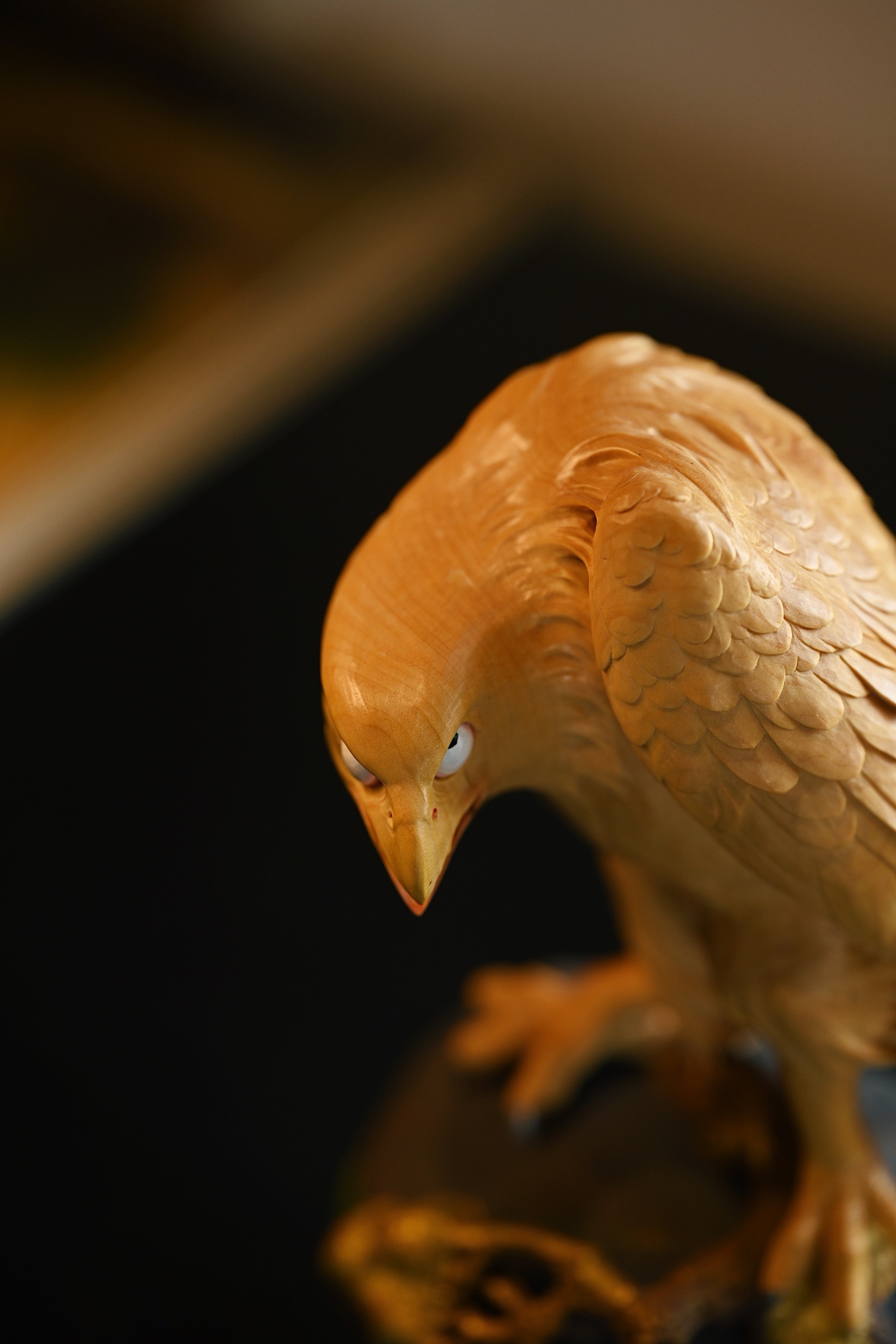 此作以黄杨木为材,取雄鹰独立于松石之姿,羽翼如叠浪,利爪似寒钩,目光上扬,桀骜不驯,虽静立而自带风雷之势,底座松石苍劲,寓意高风亮节、壮志凌云。